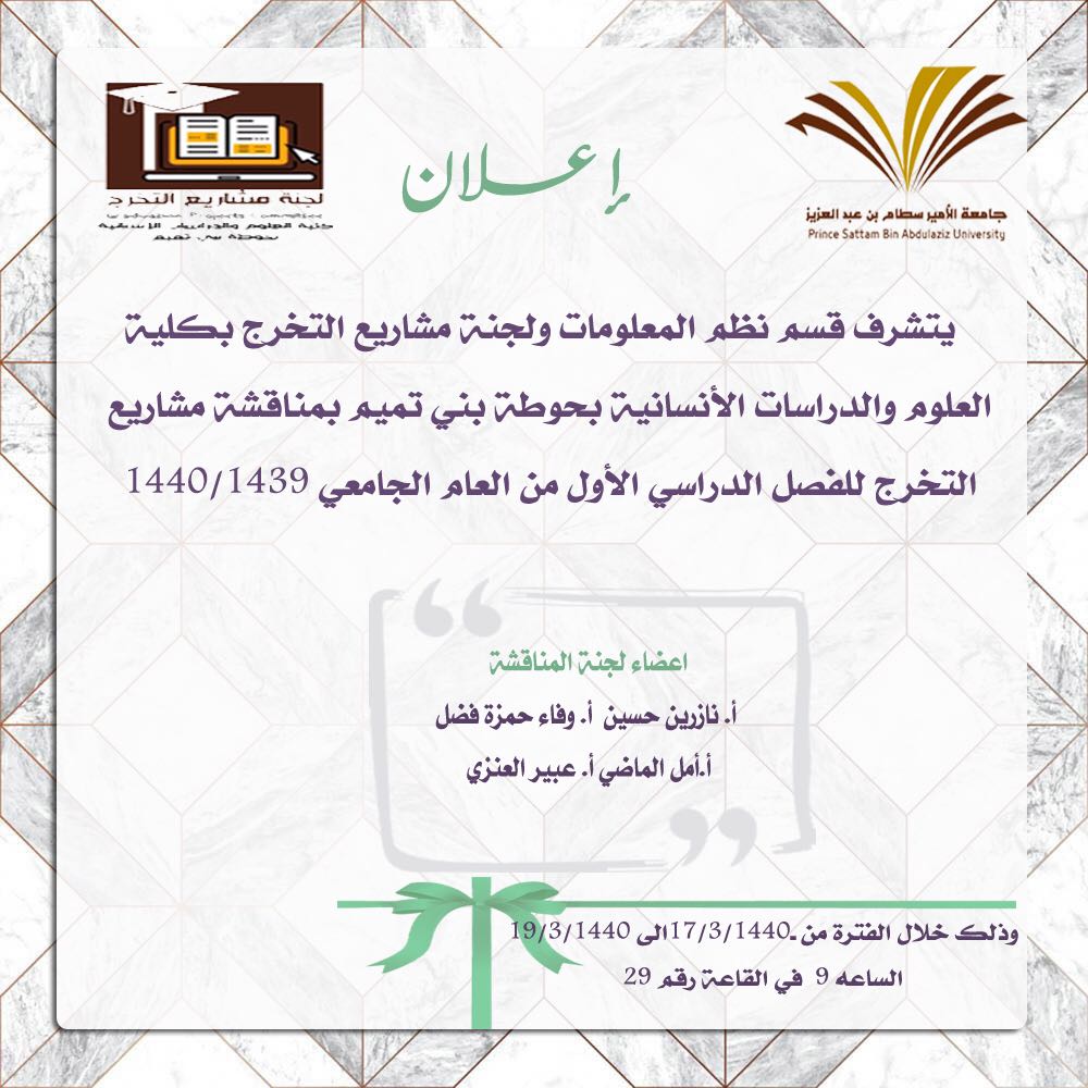 الموافق 17/ 3/ 1440 هـ على مدار ثلاثة أيام في قاعة رقم 29 بالمبنى الرئيسي. حيث قامت لجنة مشاريع التخرج بقسم نظم المعلومات برئاسة أ/ نازرين حسين منسقة مشاريع التخرج بالقسم و عضوية كل من أ/ وفاء حمزة، أ. أمل الماضي و أ. عبير العنزي بتقويم مشاريع التخرج 1 . كان عدد الطالبات اللاتي تم مناقشتهن 47 طالبة على مدى ثلاثة أيام بواقع ساعتين يومياً. ومن خلال هذه الفعالية تم: