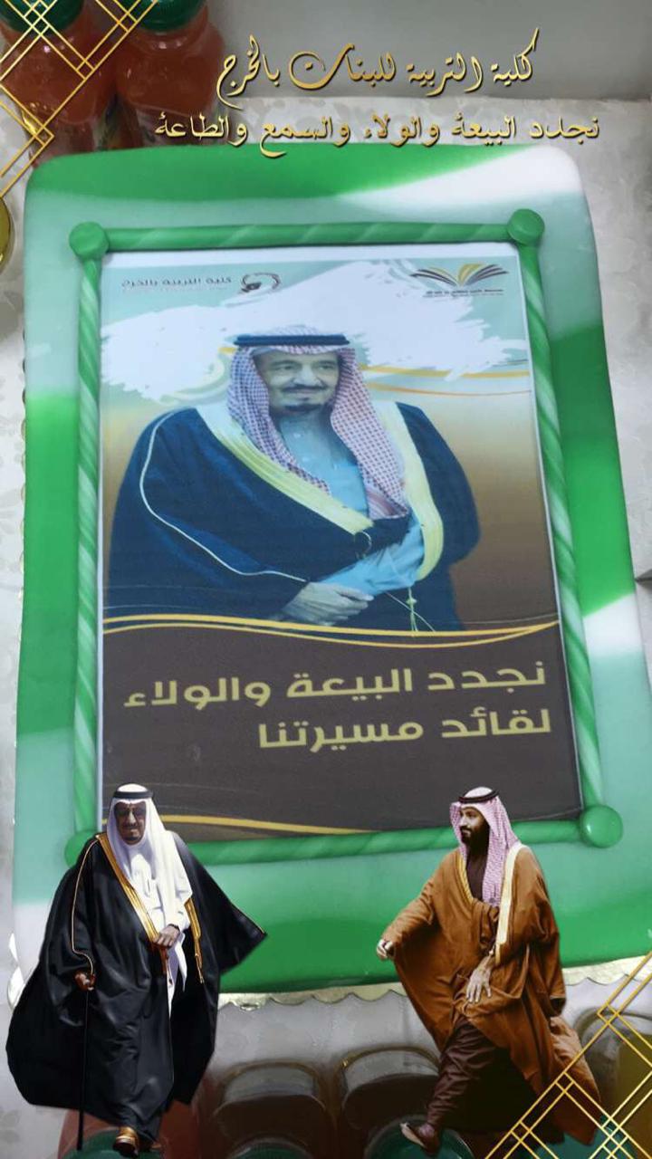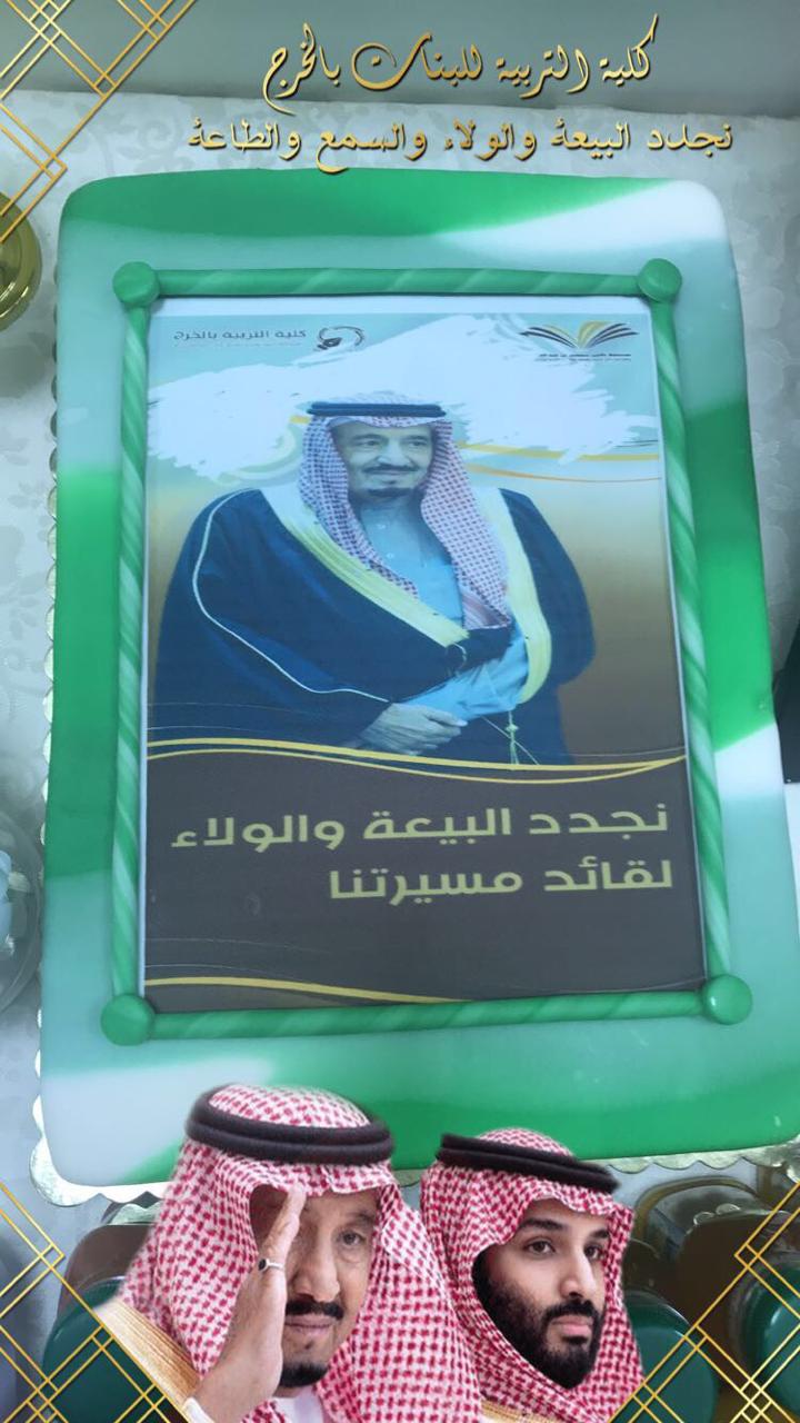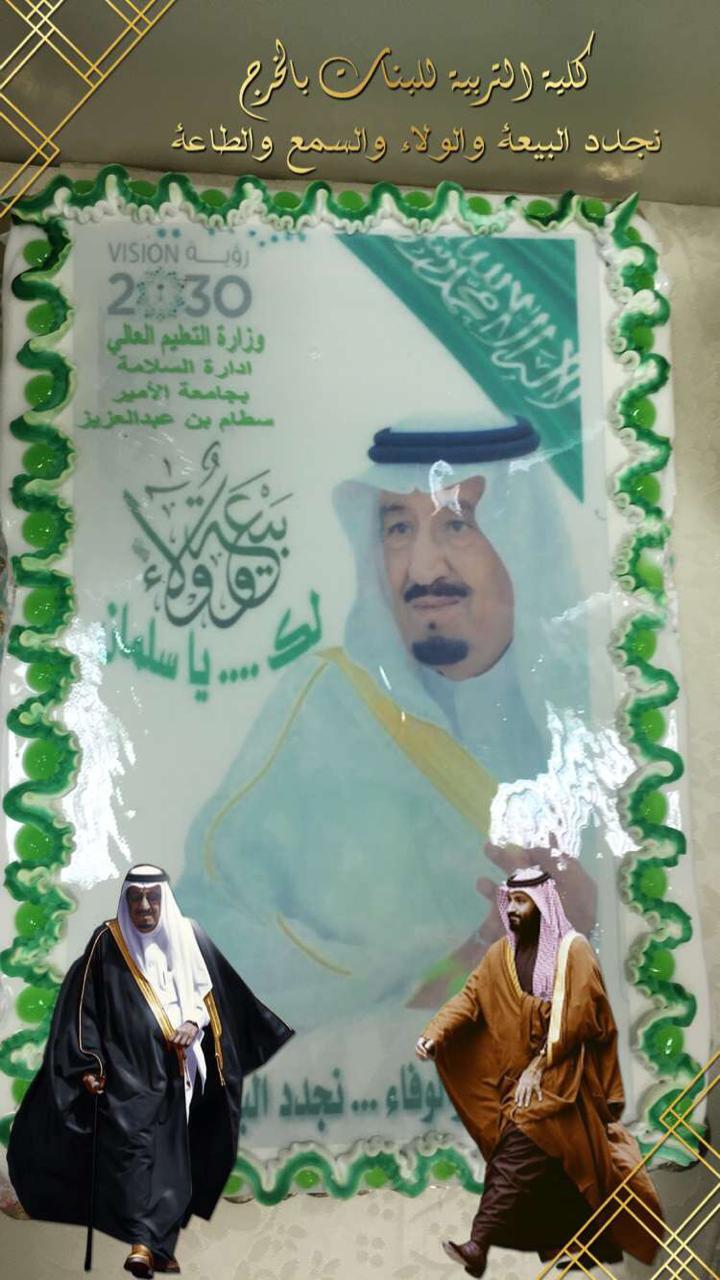 تحت رعاية وكيلة الشؤون المالية والادارية سعادة الدكتورة نورة بنت عبدالعزيز العلي احتفلت منسوبات كلية التربية بالخرج و بمشاركة إدارة الامن والسلامة في الجامعة بتجديد البيعة الرابعة لخادم الحرمين الشريفين، التي تحل ونحن نعيش في واحة من الأمن ورغد من العيش، فتتسابق الإنجازات وتتعاظم المنجزات فتكبر الآمال، وتزيد الطموحات عندما نسابق الزمن بعقيدة راسخة، وقيادة حكيمة، ورؤية تؤسس لغدٍ زاهر مشرق لينعم أبناء هذا الوطن بالراحة والرفاهية، وكما ردد الملك سلمان في عدد من المناسبات أن الإنسان السعودي هو هدف التنمية الأول»