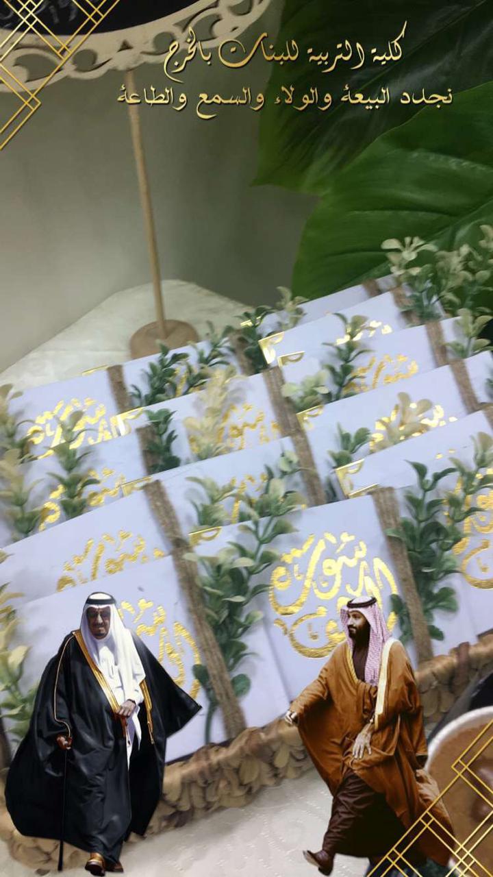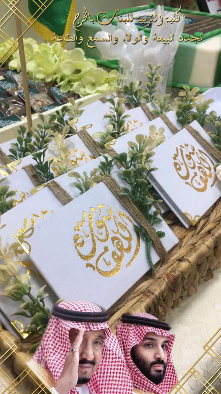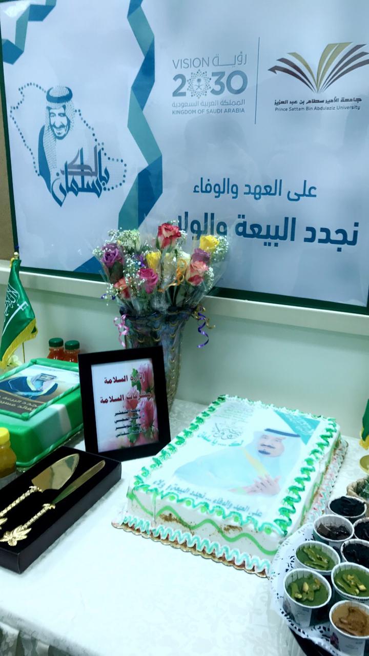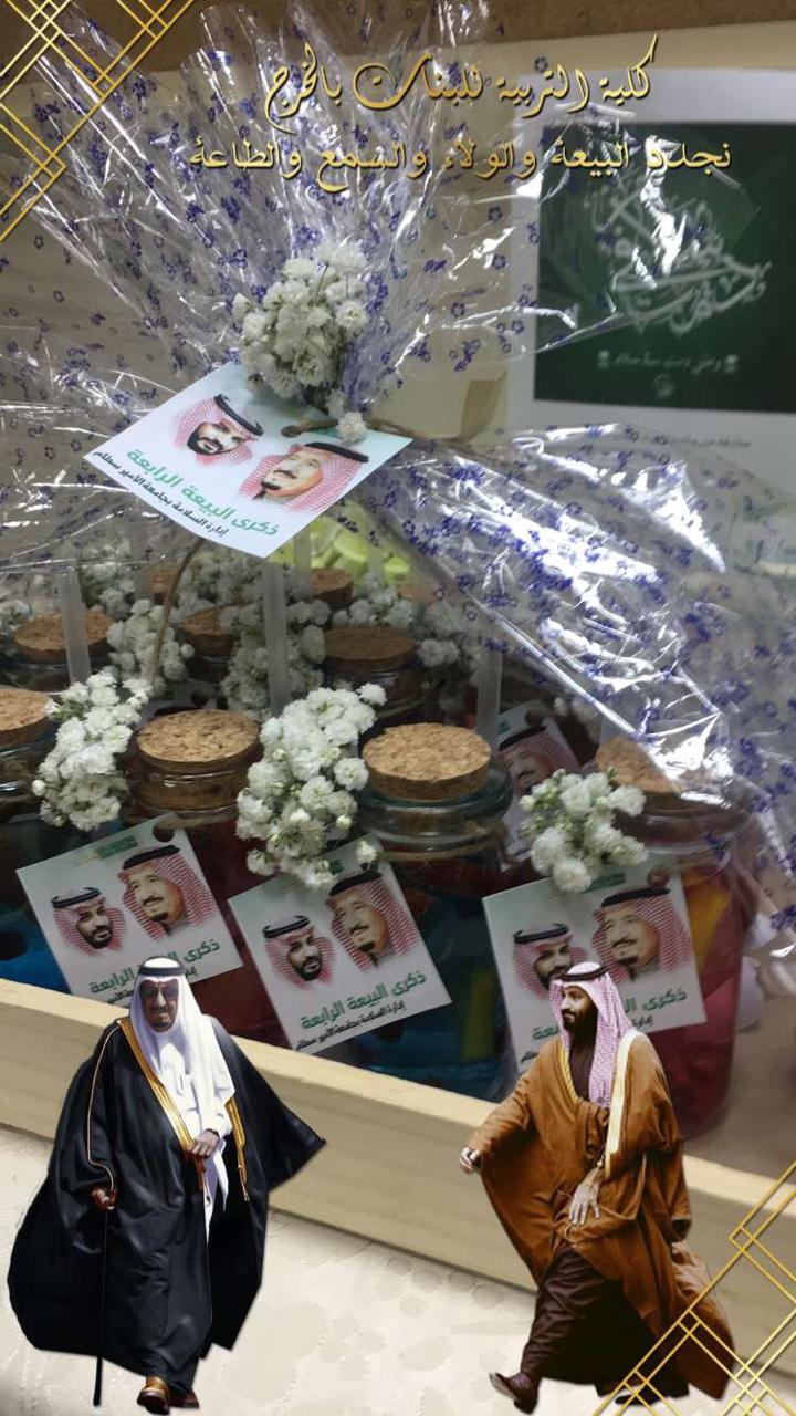 تحت رعاية وكيلة الشؤون المالية والادارية سعادة الدكتورة نورة بنت عبدالعزيز العلي احتفلت منسوبات كلية التربية بالخرج و بمشاركة إدارة الامن والسلامة في الجامعة بتجديد البيعة الرابعة لخادم الحرمين الشريفين، التي تحل ونحن نعيش في واحة من الأمن ورغد من العيش، فتتسابق الإنجازات وتتعاظم المنجزات فتكبر الآمال، وتزيد الطموحات عندما نسابق الزمن بعقيدة راسخة، وقيادة حكيمة، ورؤية تؤسس لغدٍ زاهر مشرق لينعم أبناء هذا الوطن بالراحة والرفاهية، وكما ردد الملك سلمان في عدد من المناسبات أن الإنسان السعودي هو هدف التنمية الأول»