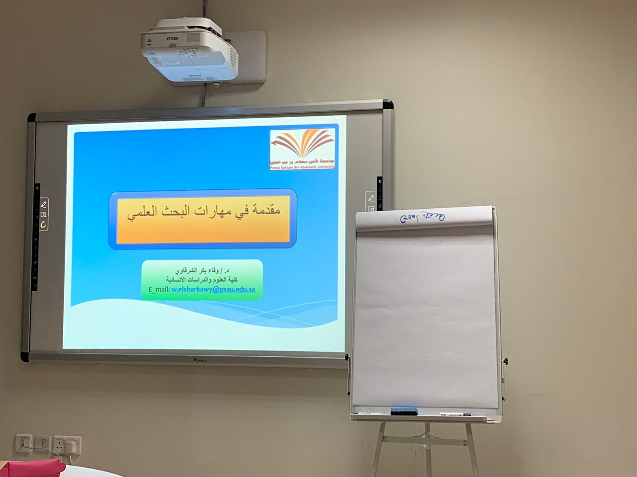 تحت إشراف لجنة التأهيل الوظيفي لوحدة الخريجات بكلية العلوم والدراسات الإنسانية بالخرج(طالبات) أقيمت دورة بعنوان (مقدمة في مهارات البحث العلمي) وذلك في يوم الأحد 29/6/1441هـ من تقديم وإعداد الدكتورة وفاء الشرقاوي بقاعة التدريب.