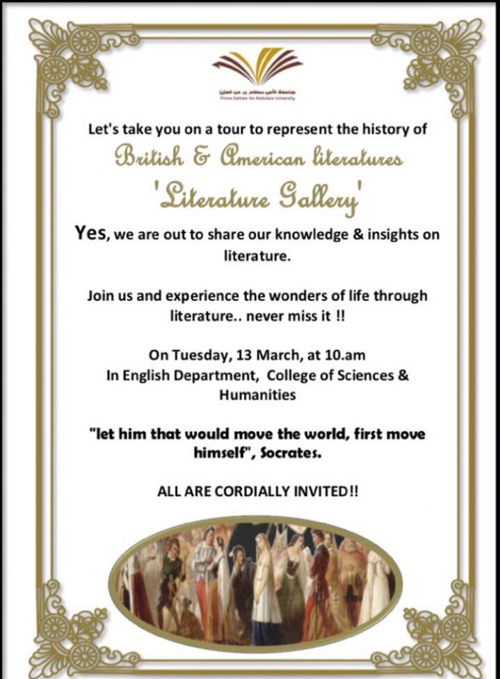أقام قسم اللغة الإنجليزية بالكلية يوم الثلاثاء الموافق 25/6/1439 هـ وبإشراف لجنة النشاط في القسم أمام قسم اللغة الإنجليزية معرضَا للغة والأدب.