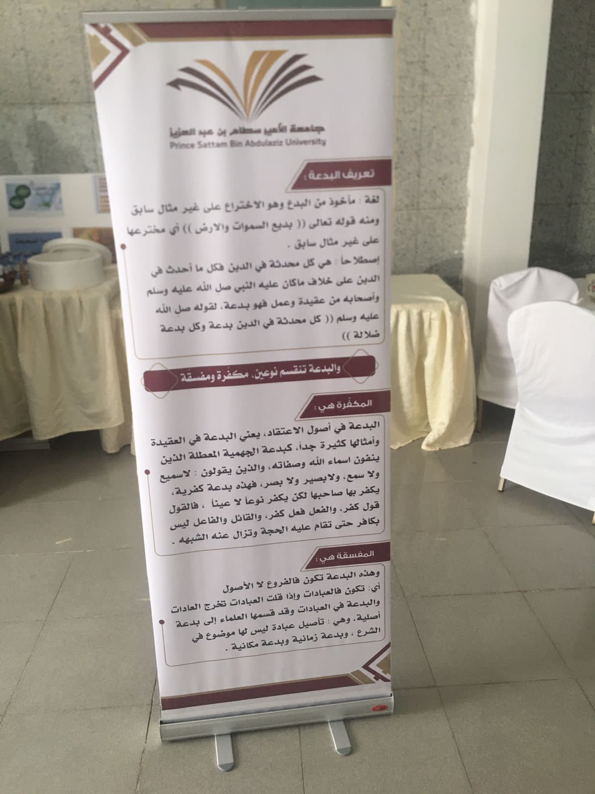 ضمن فعاليات الأنشطة الطلابية وبالتعاون مع مكتب العمل الطلابي أقامت قسم الدراسات الإسلامية فعالية بعنوان: (معرض العقيدة ) وذلك في يوم الثلاثاء (30 /3/202) من الساعة (10_12)ظهراً بإشراف دكتورة :نعيمه السنيد ،ودكتورة مها الخطيب وقد هدفت الفعالية إلى بيان المنهج السليم في العقيدة ونبذ الفرق الضالة والمنحرفة وبيان مصادر العقيدة وأهميتها، وقد اشتمل المعرض على ثلاث أركان ، الركن الأول :انواع العقيدة وفيه عرض لمعنى العقيدة الصحيحة وفوائدها على الفرد والأسرة والمجتمع، وبيان للعقيدة الفاسده وبيان خطرها على الفرد والأسرة والمجتمع.
