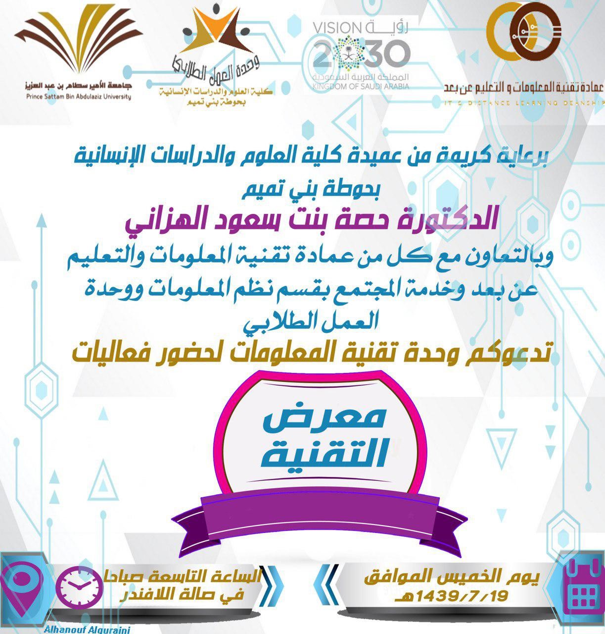 أقامت وحدة تقنية المعلومات بالتعاون مع عمادة تقنية المعلومات والتعليم عن بعد ووحدة العمل الطلابي وخدمة المجتمع بقسم نظم المعلومات وفي ظل رعاية عميدة كلية العلوم والدراسات الانسانية بحوطة بني تميم سعادة الدكتورة حصة الهزاني (معرض التقنية الثاني) وذلك بمبنى الكلية بحوطة بني تميم وقد كان عدد الحضور 62 تقريبا من الطالبات و 12 من أعضاء هيئة التدريس و 12 من الإداريات. تم عقد المعرض في صالة اللافندر بساحة الكلية الساعة التاسعة صباحاً يوم الخميس 19-7-1439 هـ. كان المعرض من توجيه وإشراف الأستاذات: أ.سلوى الصادق – أ.تغريد المدني – أ. الهنوف القريني – أ.نورة العقيلي – أ.بدرية الخليل.