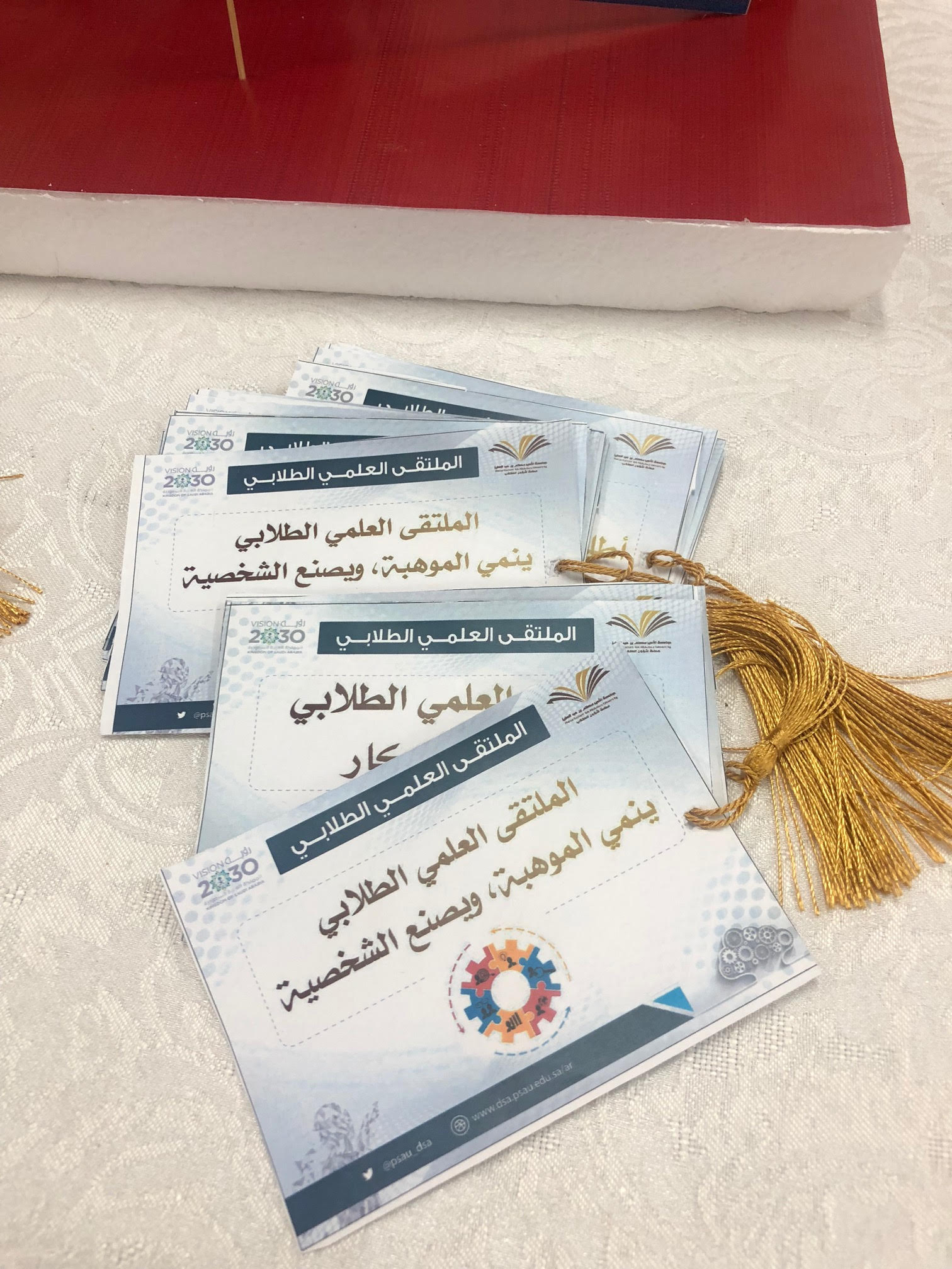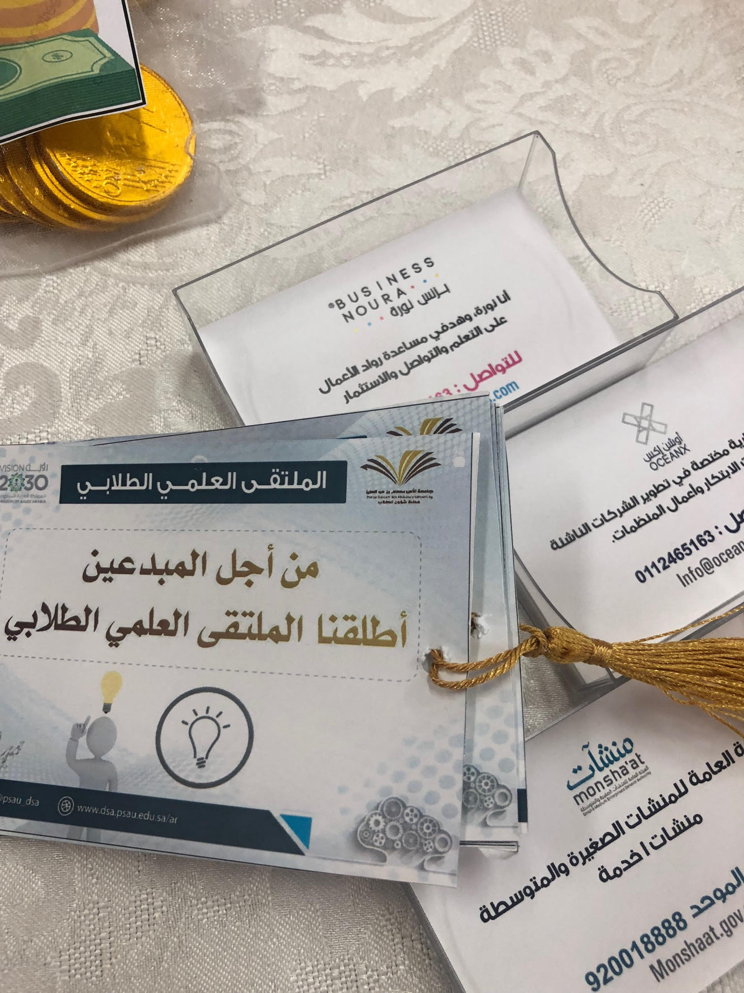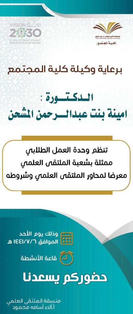 تزامنا مع استعداد كلية المجتمع بالخرج للملتقى العلمي الرابع الذي تنظمه عمادة شؤون الطلاب بجامعة الأمير سطام بن عبدالعزيز ؛ أقامت وحدة العمل الطلابي ممثله بشعبة الملتقى العلمي يوم الاحد الموافق 6-7-1441هـ معرض محاور الملتقى العلمي الرابع الذي يهدف إلى تشجيع الطالبات على المشاركة في محاور الملتقى العلمي المتنوعة .