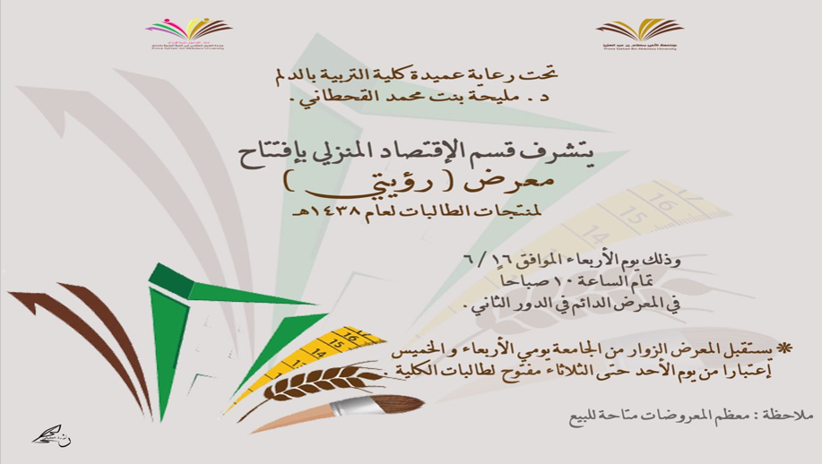 افتتحت الدكتورة نورة الزعاقي رئيسة الوحدة الإشرافية على كليات البنات بالجامعة و عميدة الكلية الدكتورة مليحة القحطاني ، معرض ( رؤيتي ) لمنتجات طالبات قسم الاقتصاد المنزلي يوم الأربعاء الموافق 16/6/1438هـ الساعة العاشرة صباحاً بالمعرض الدائم بالكلية .