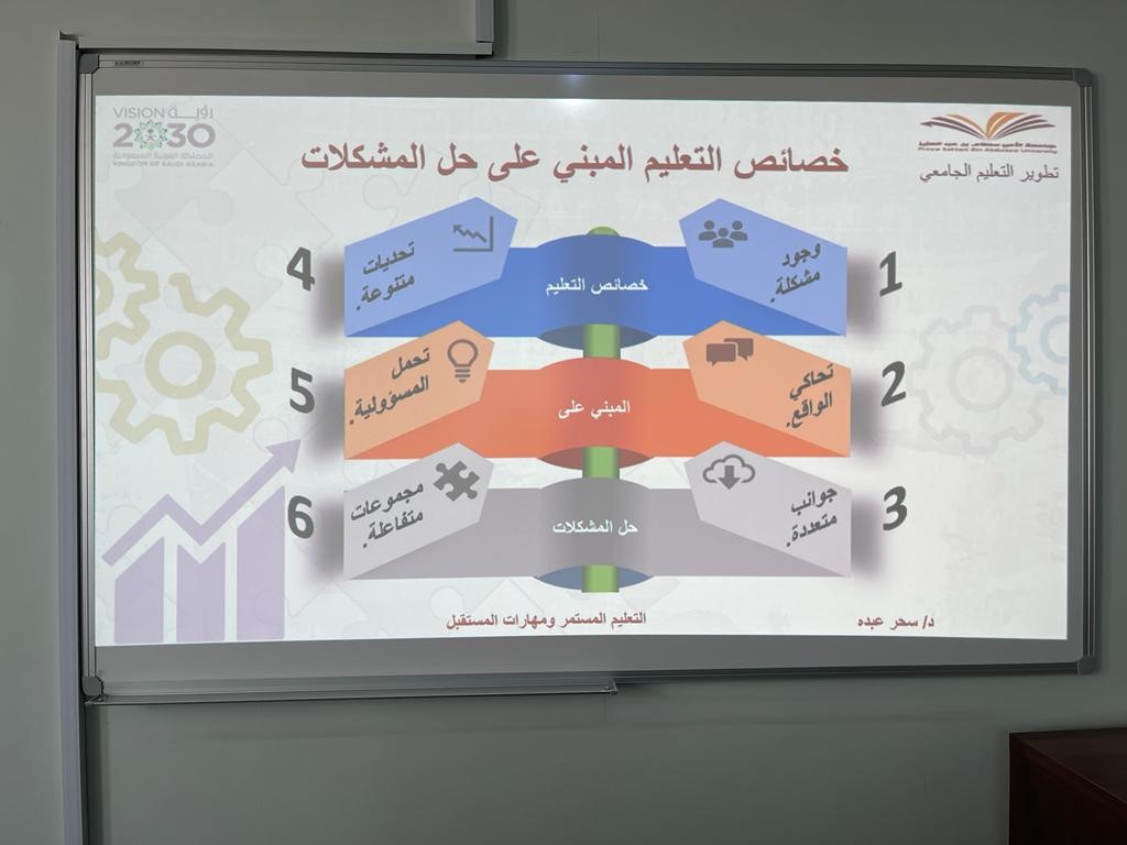 اقام مركز تطوير التعليم الجامعي بجامعة الأمير سطام بن عبد العزيز بالتعاون مع وحدة التخطيط والتطوير بالكلية ورشة عمل استهدفت عضوات هيئة التدريس ومن في حكمهن بعنوان" التعليم المستمر ومهارات المستقبل "تحت مبادرة (الكلية المدربة) وذلك صباح يوم الأربعاء العشرين من شهر شعبان لعام 1443هـ في قاعة التدريب.