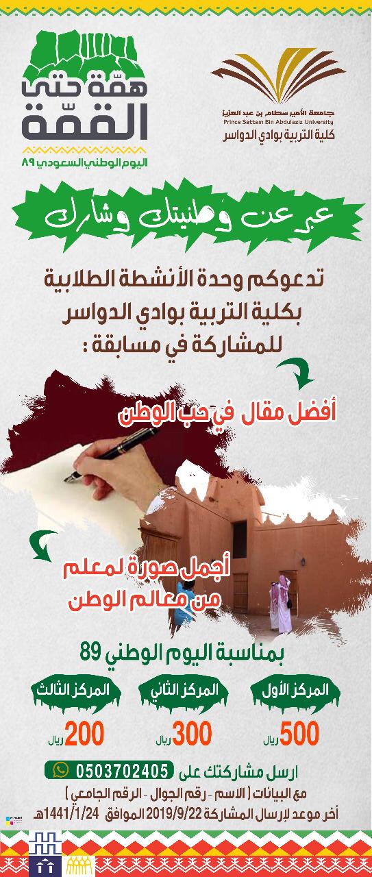 أعلنت كلية التربية بوادي الدواسر ممثلة بوحدة الأنشطة الطلابية عن إطلاق مسابقة لأفضل مقال في حب الوطن وأجمل صورة لمعلم من معالم الوطن ( للطلاب ) بمناسبة احتفال المملكة باليوم الوطني الـ 89 تحت مسمى (عبر عن وطنيتك وشارك ) .