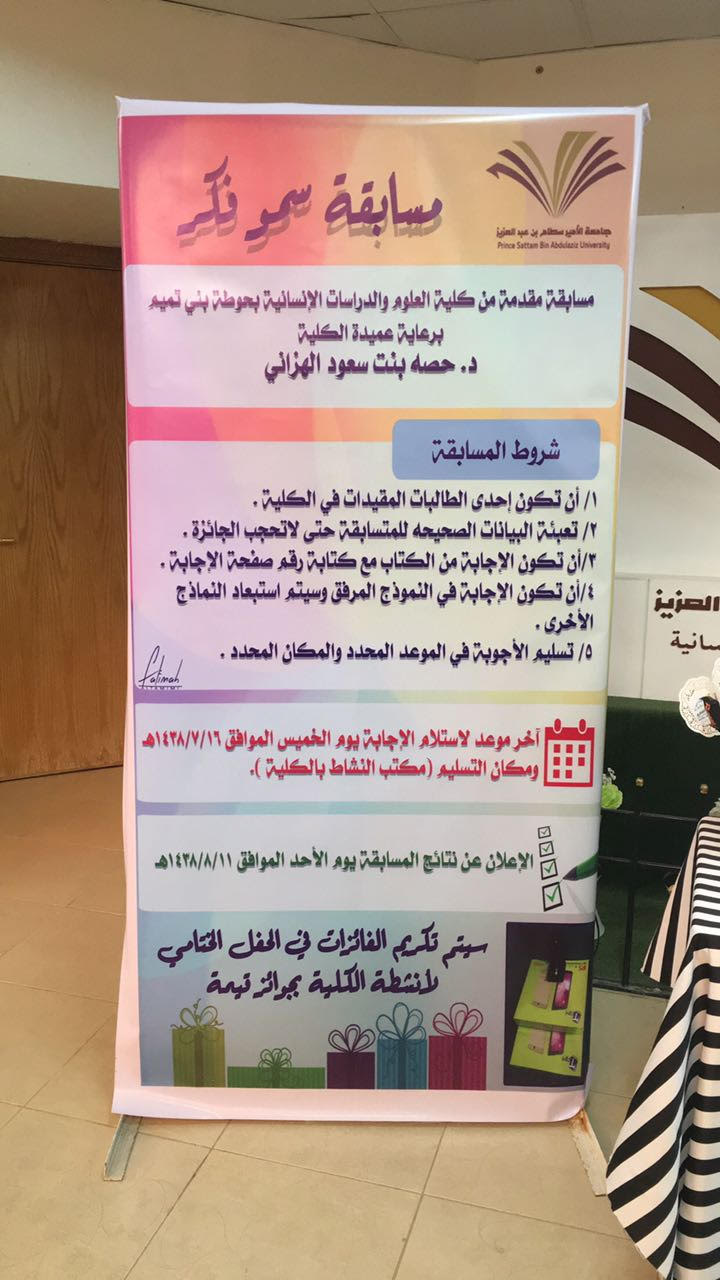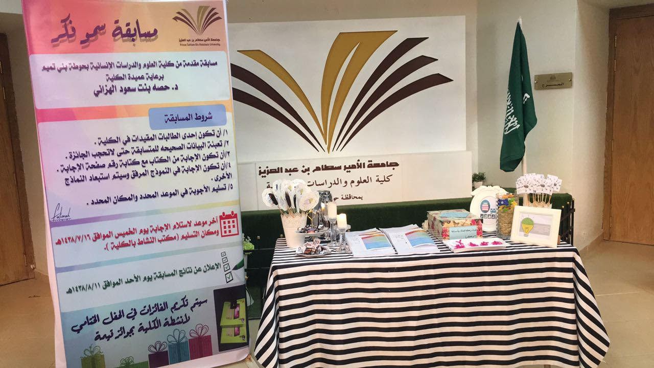 قدمت عميدة كلية العلوم والدراسات الإنسانية بحوطة بني تميم د. حصة بنت سعود الهزاني مسابقة بالكلية بعنوان (سمو فكر) تتمحور المسابقة في طرح عدد من الأسئلة حول بحث بعنوان (الشريعة الإسلامية وأثرها في تعزيز الأمن الفكري) لفضيلة الشيخ الدكتور عبدالرحمن بن عبدالعزيز السديس من كتاب (الأمن الفكري) وهو من مطبوعات جامعة نايف للعلوم الأمنية. تهدف المسابقة إلى حث الطالبات على قراءة ماهو نافع ومفيد وتحصين الفكر من الآراء المتطرفة والمنحرفة وكذلك تعزيز الأمن الفكري، حيث قامت عميدة الكلية بتدشين المسابقة يوم الأثنين الموافق ٢٨ /٦ /١٤٣٨هـ في ساحة الكلية وذلك بالإعلان عن المسابقة بوضع ركن يحتوي على نماذج من أسئلة المسابقة مع نسخة من البحث والتوزيعات وبنر يحتوي على شروط المسابقة ومواعيد استلام الأجوبة علما بأنه تم رصد جوائز قيمة للمسابقة.