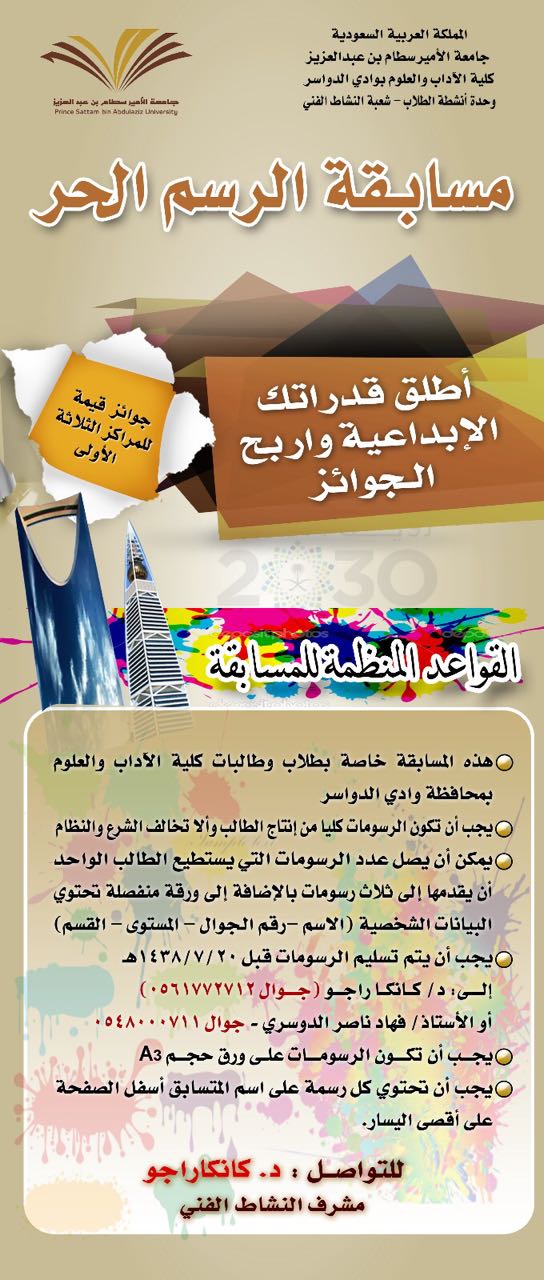 وقد حددت المسابقتين بشروط موجودة بالإعلان المرفق بالخبر ، وأن المسابقتان لطلاب وطالبات كلية الآداب والعلوم فقط . وأن أخر موعد لتسليم مشاركات المشتركين في المسابقتان هو 1438/7/20هـ ويكون التسليم عن طريق الدكتور / كانكا راجو ( جوال رقم 0561772712 ) هذا بالنسبة للمسابقة الرسم الحر .