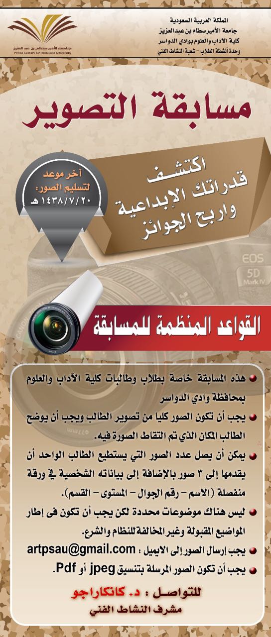 أما بالنسبة لمسابقة التصوير بإرسال المطلوب على الأيميل artpsau@gmail.com وذلك حسب ما هو مطلوب بالإعلان . وسوف يتم استبعاد إي مشاركة لا تنطبق عليها شروط المسابقة .