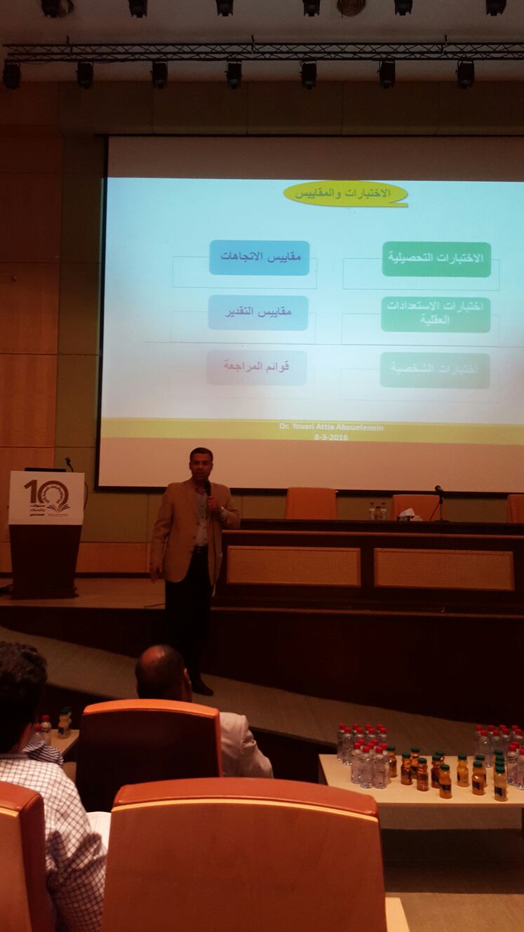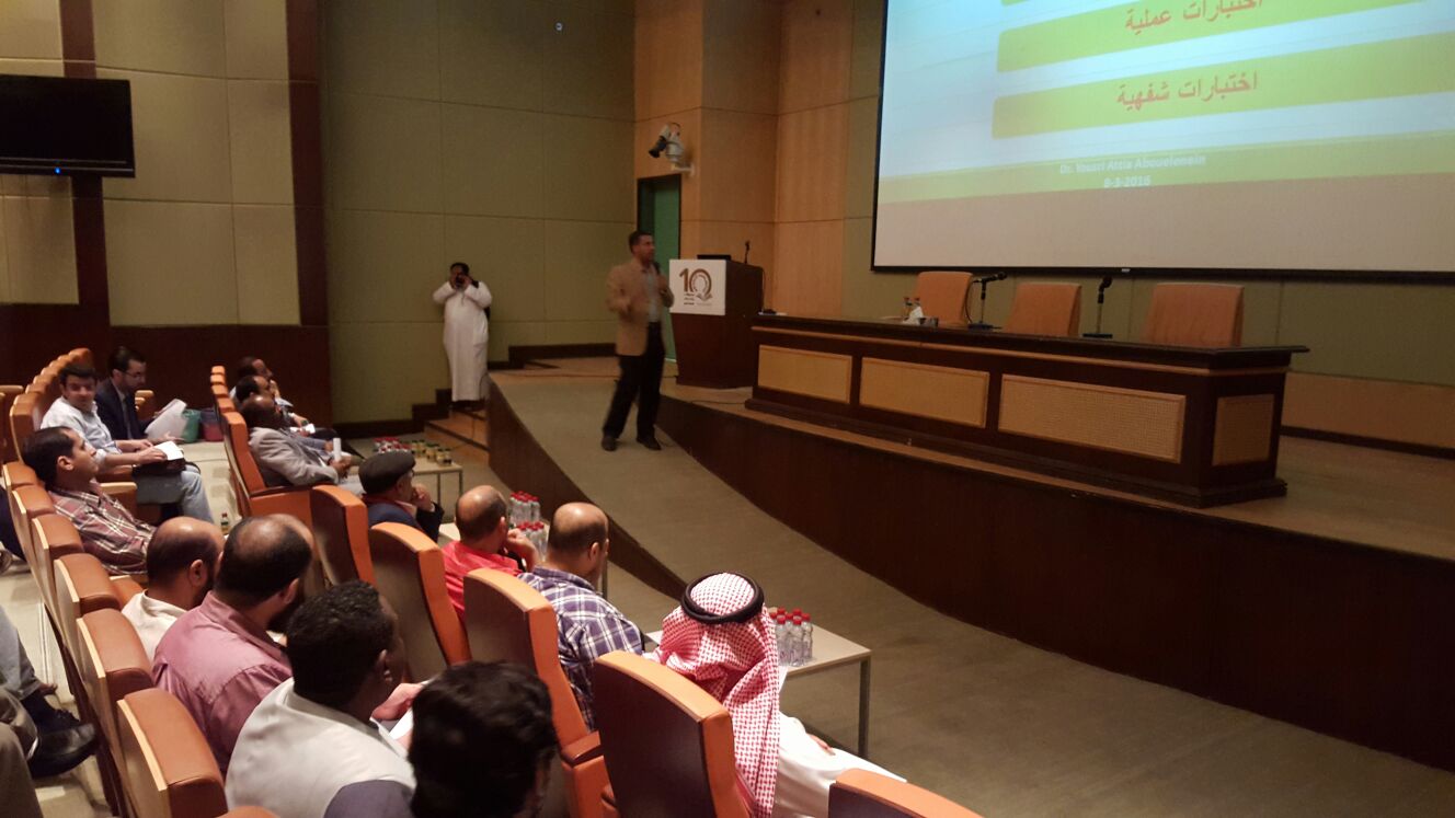 أدار الورشة وقدمها الدكتور يسري عطية المستشار بوكالة الجامعة للشؤون التعليمية وتستهدف الورشة أعضاء الهيئة التعليمية وذلك لمَ لمصفوفة الاختبارات من أهمية في عملية ضبط ووضع الأسئلة واستيعاب مفردات المقرر مما يمكن عضو هيئة التدريس من وضع اختبار متكامل يغطي جميع الجوانب الفكرية والمعرفية .