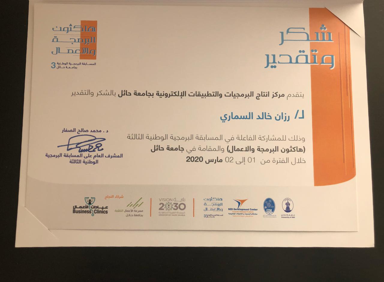 شاركت كلية هندسة وعلوم الحاسب بجامعة سطام في المسابقة البرمجية الوطنية الثالثة (هاكثون البرمجة والأعمال ) المقامة في جامعة حائل خلال الفترة من 01 إلى 02 مارس 2020 متمثلة بالطالبة / رزان خالد السماري حيث رشحت مشاركتها إلى العشرة المراكز الأولى للعرض على المستثمرين وللتصفيات النهائية .