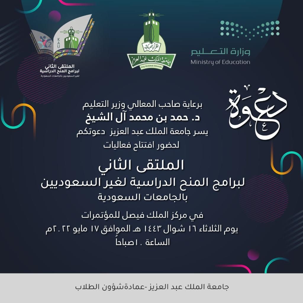 شاركت عمادة شؤون الطلاب بجامعة الأمير سطام بن عبدالعزيز في الملتقى الثاني لبرامج المنح الدراسية لغير السعوديين بالجامعات ومؤسسات التعليم العالي السعودية، و المنعقد بجامعة الملك عبدالعزيز وذلك يوم الثلاثاء الموافق ١٤٤٣/١٠/١٦ هـ؛ والذي شهد مشاركة أكثر من ١٠٠ طالب من طلاب المنح الدراسية يمثلون ٢٤ جامعة سعودية، واستمرت يومين وذلك بمركز الملك فيصل للمؤتمرات.