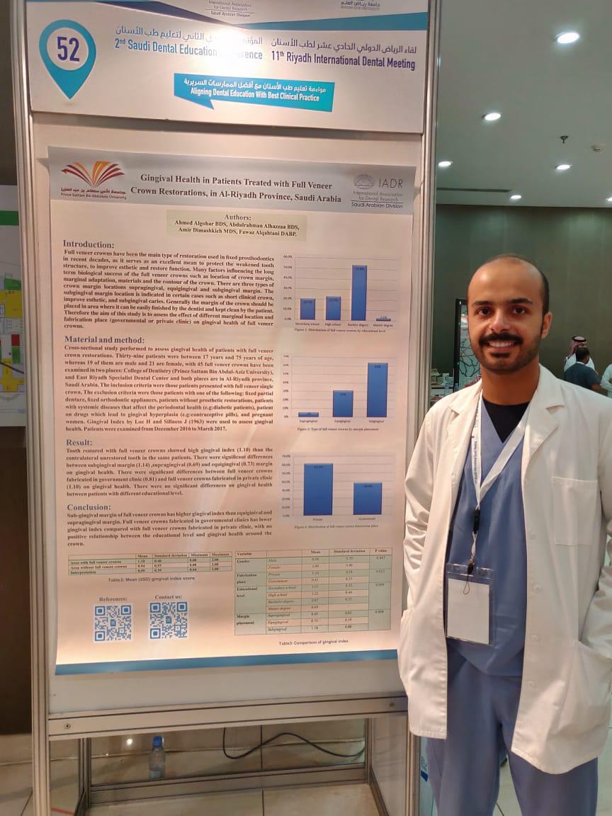 2- (تقييم صحة اللثة في المرضى الذين تمت معالجتهم بالتلبيسات التاجية الكاملة، في منطقة الرياض) قدمها المعيد أحمد الجوهر من قسم الاستعاضة السنية.