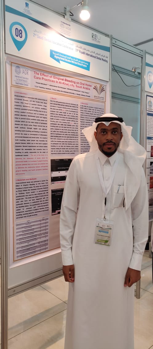 3- (تأثير نزيف اللثة على العناية المنزلية بصحة الفم في الخرج دراسة مقطعية) قدمها المعيد يوسف الخيبري من قسم وقاية الأسنان.