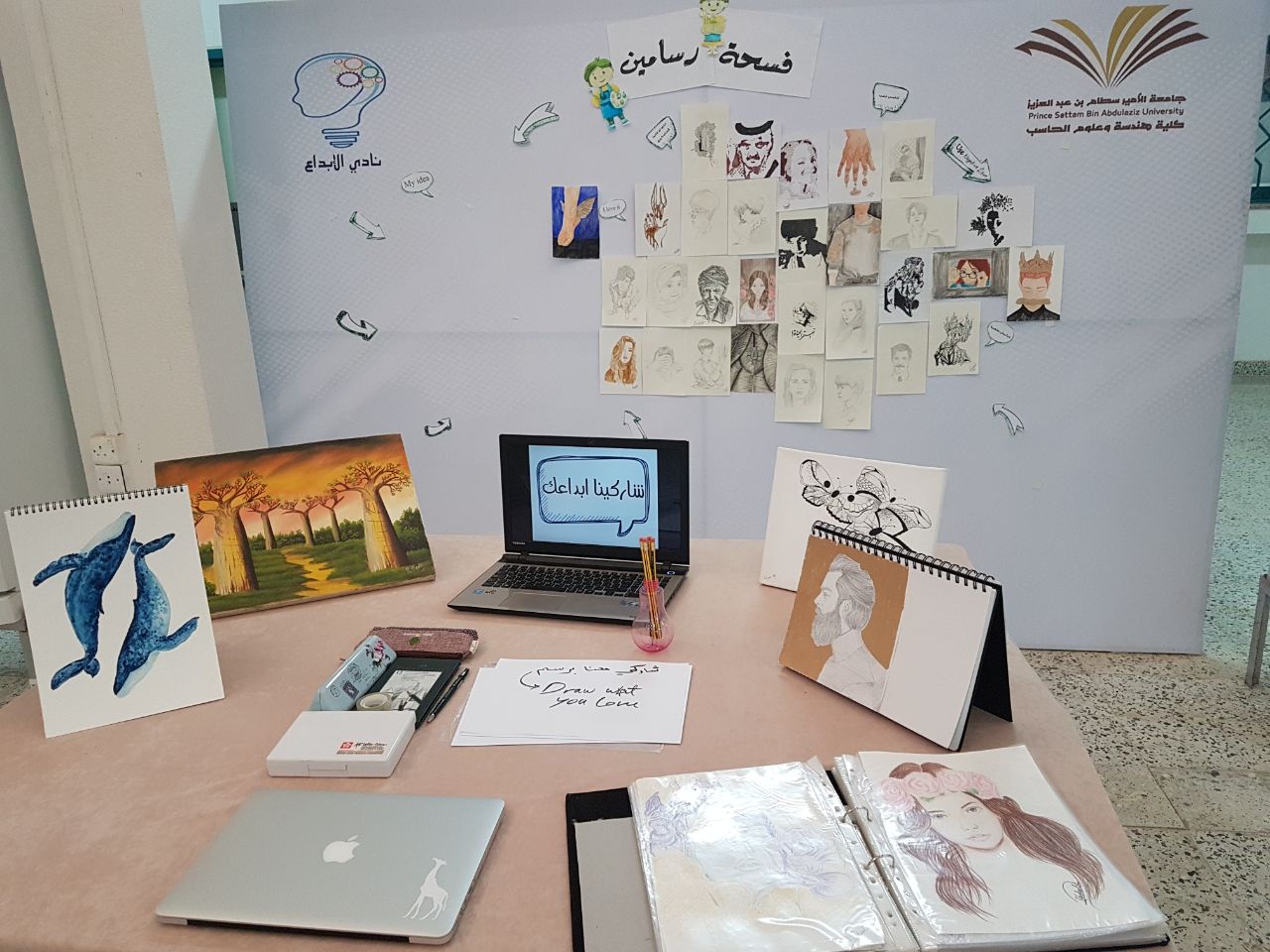 و في اطار دعم المواهب واستكشافها أقام نادي الإبداع يوم الخميس ٢٤ -٦ - ١٤٣٨ فعالية "فسحة رسامين " في ساحة الكلية حيث هدفت الفعالية لعرض أعمال الطالبات من رسومات والكشف عن مواهبهن وتشجيعهن على الإبداع وتحفيزها عبر تلقي الطالبة المشاركة في الفعالية للعديد من آراء وملاحظات طالبات الكلية أعضاء هيئة التدريس التحفيزية بالاضافة إلى تبادل المعرفة والتجارب بين الرسامات المشاركات من طالبات الكلية وتستمر الفعالية الى الأسبوع القادم باذن الله لإستقبال أكبر قدر من المشاركات وتعليقها في ساحه الكلية .