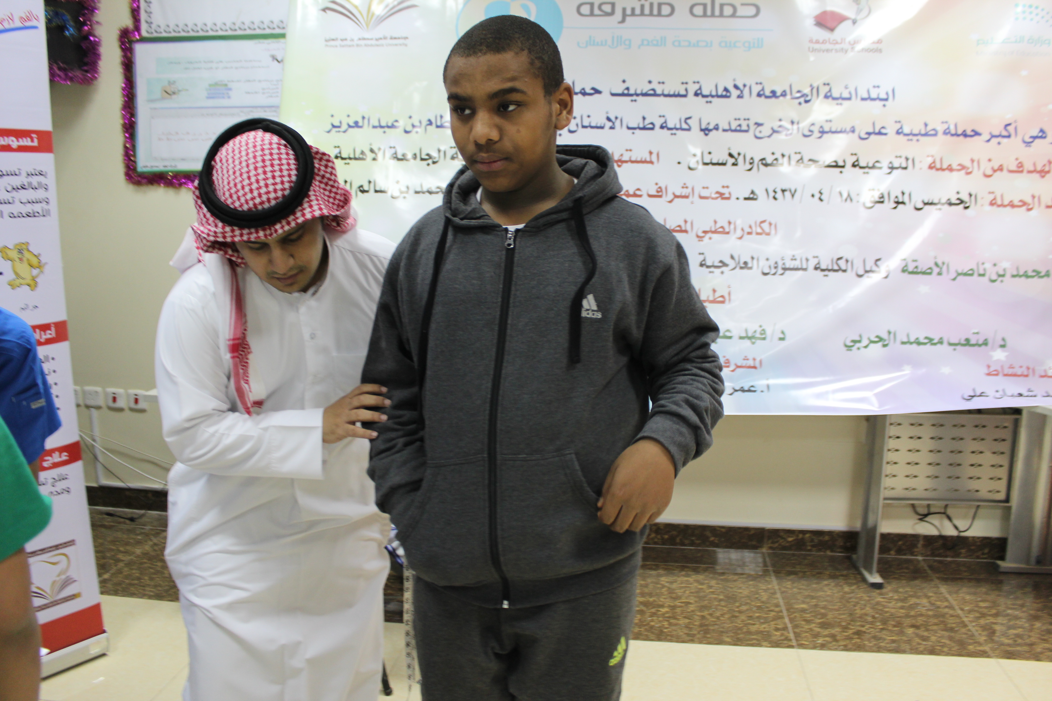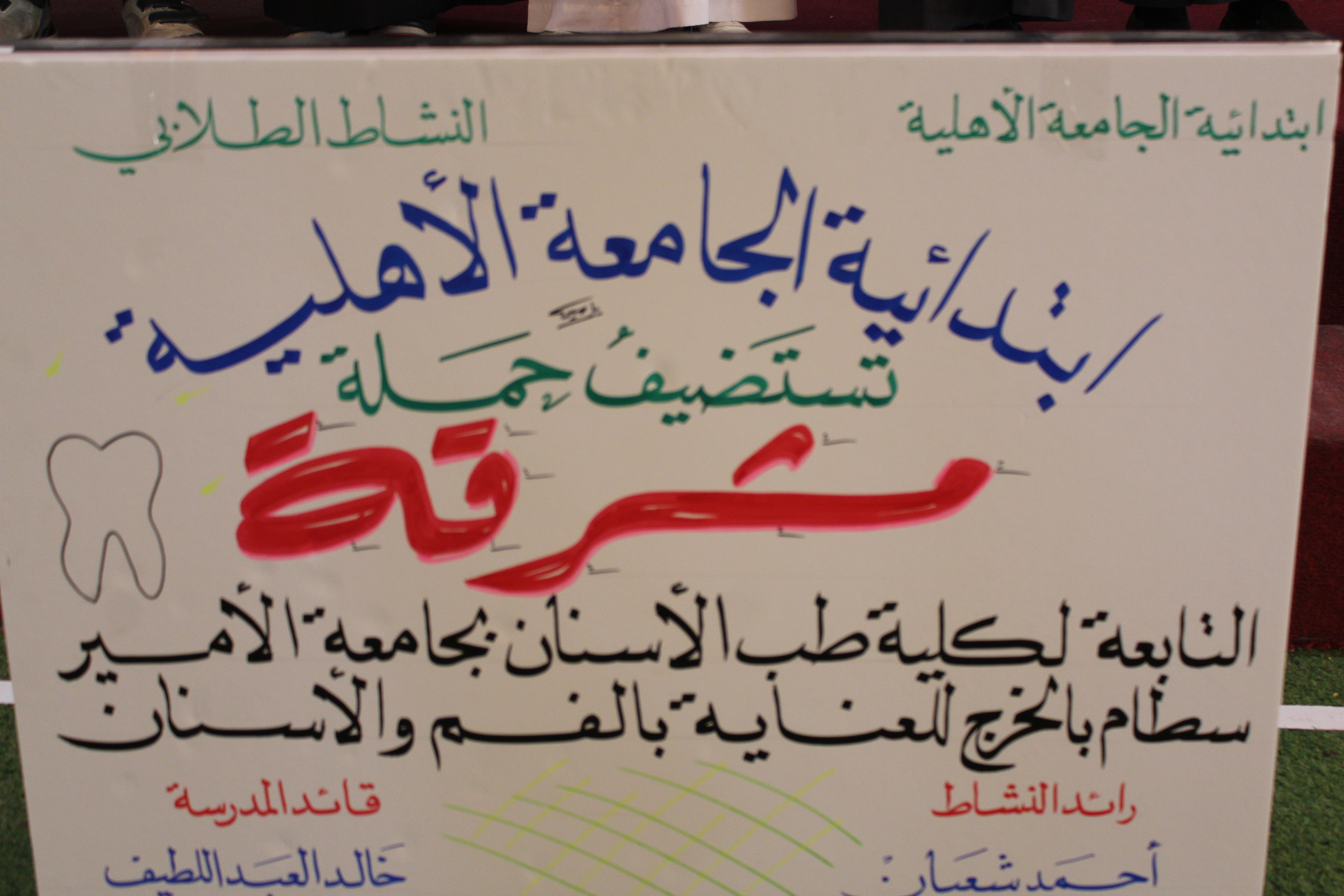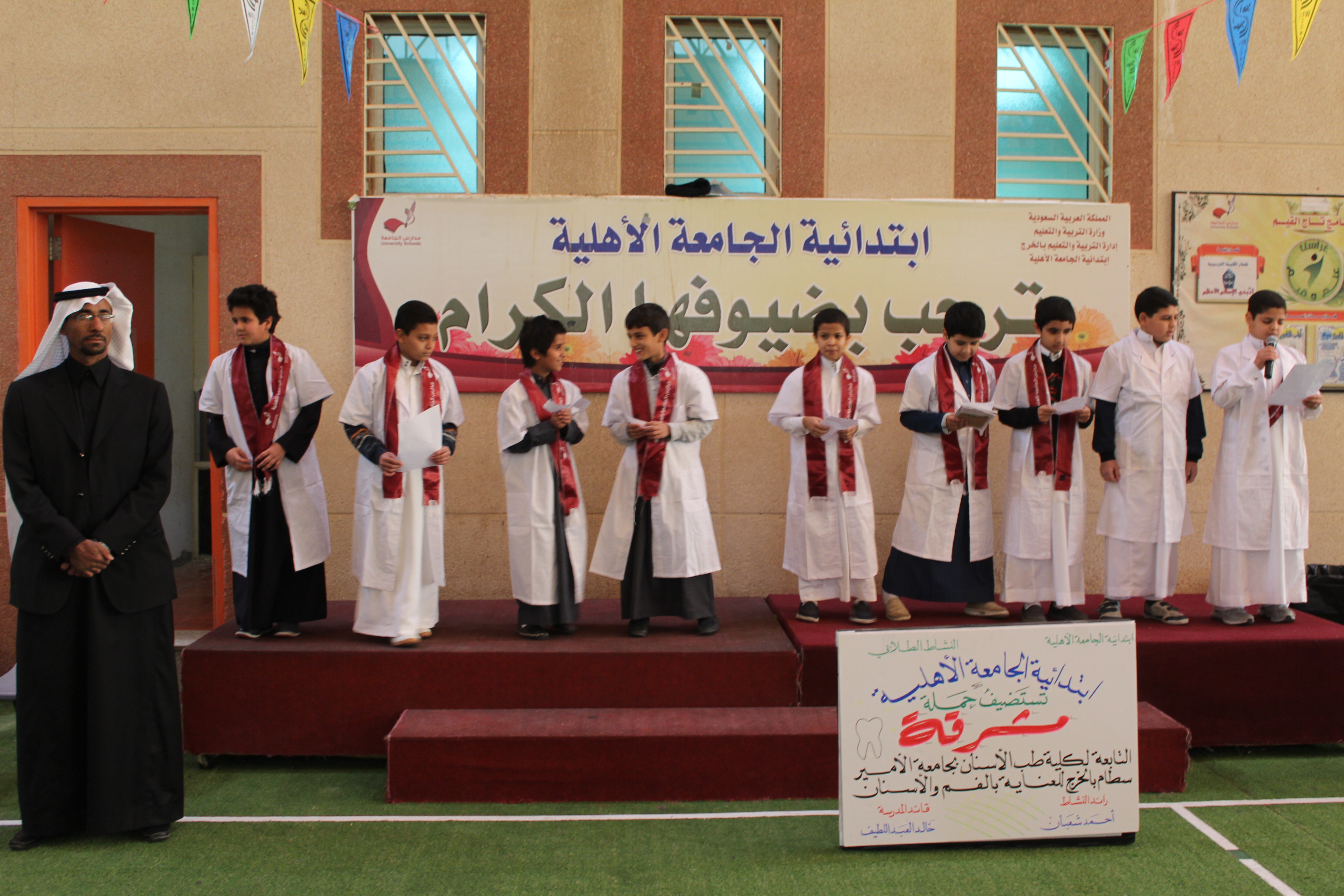 استمراراً لجهود الكلية لحملة مشرقة(بالفم لازم نهتم ) في نشر التوعية الصحية للأسنان وتحت إشراف عميد كلية طب الأسنان بجامعة الأمير سطام بن عبدالعزيز د.محمد المهيزع قام فريق من الكلية بزيارة مدارس الجامعة بمحافظة الخرج وذالك يوم الخميس الموافق 18/4/1437 هـ بمشاركة نخبة من أساتذة الكلية وعدد من أطباء الامتياز للكلية لتوعية طلاب المدارس بصحة الفم والأسنان كما تم الكشف على عدد كبير من الطلاب وتوزيع العينات الطبية عليهم لمساعدتهم بالاعتناء بالأسنان