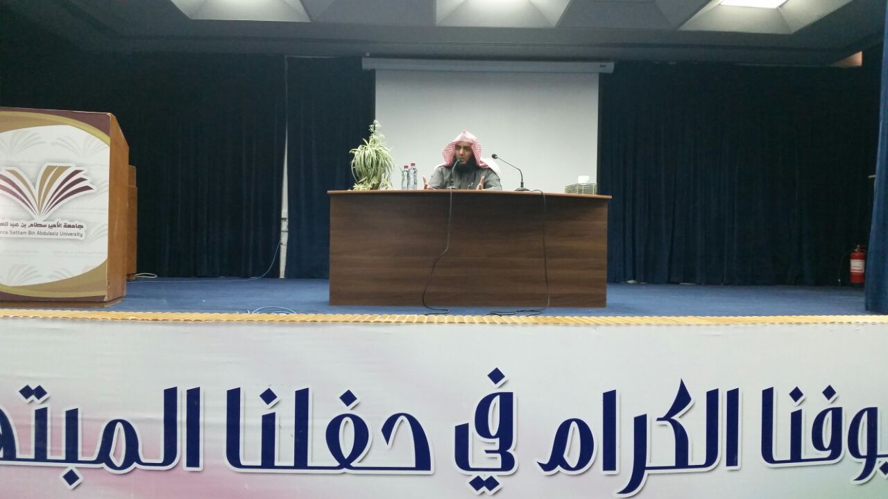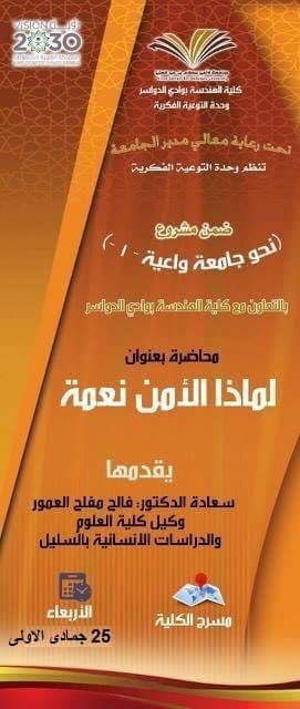 ضمن مشروع نحو جامعة واعية1 أقامت وحدة التوعية الفكرية بجامعة الأمير سطام بن عبدالعزيز بالتعاون مع كلية الهندسة بوادي الدواسر محاضرة بعنوان ( لماذا الأمن نعمه ) قدمها الدكتور مفلح بن فالح العمور عضو هيئة التدريس بكلية العلوم والدراسات الإنسانية بالسليل وذلك بمسرح الكلية .