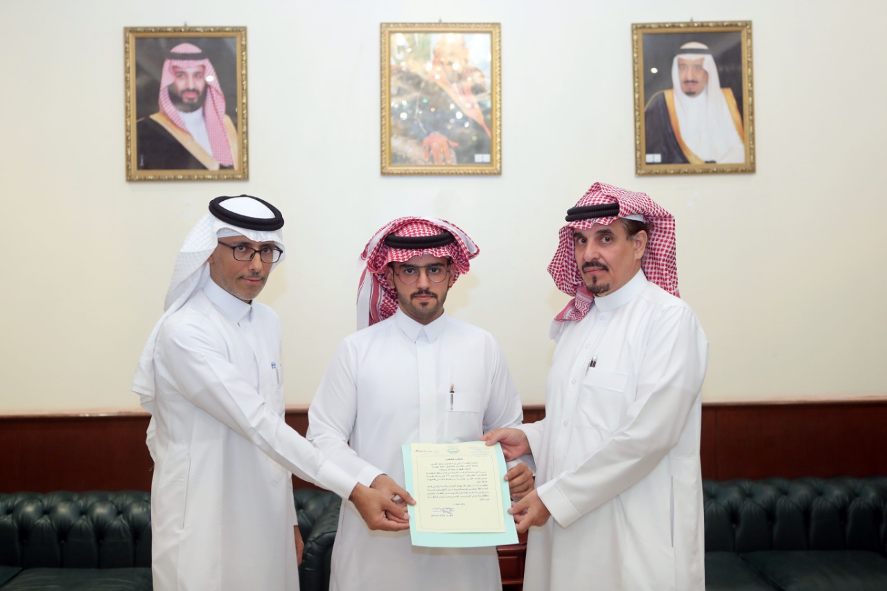 كرم مُحافظ وادي الدواسر فهد بن عبدالله المسعود في مكتبه اليوم الطالب تركي بن شجاع بن ماجد الدوسري، من قسم الهندسة الكهربائية في كلية الهندسة بجامعة الأمير سطام بن عبدالعزيز، والفائز بالمركز الأول عن ابتكار الاتصال في المسابقة الوطنية "عصف" التي نظمتها جامعة حائل.