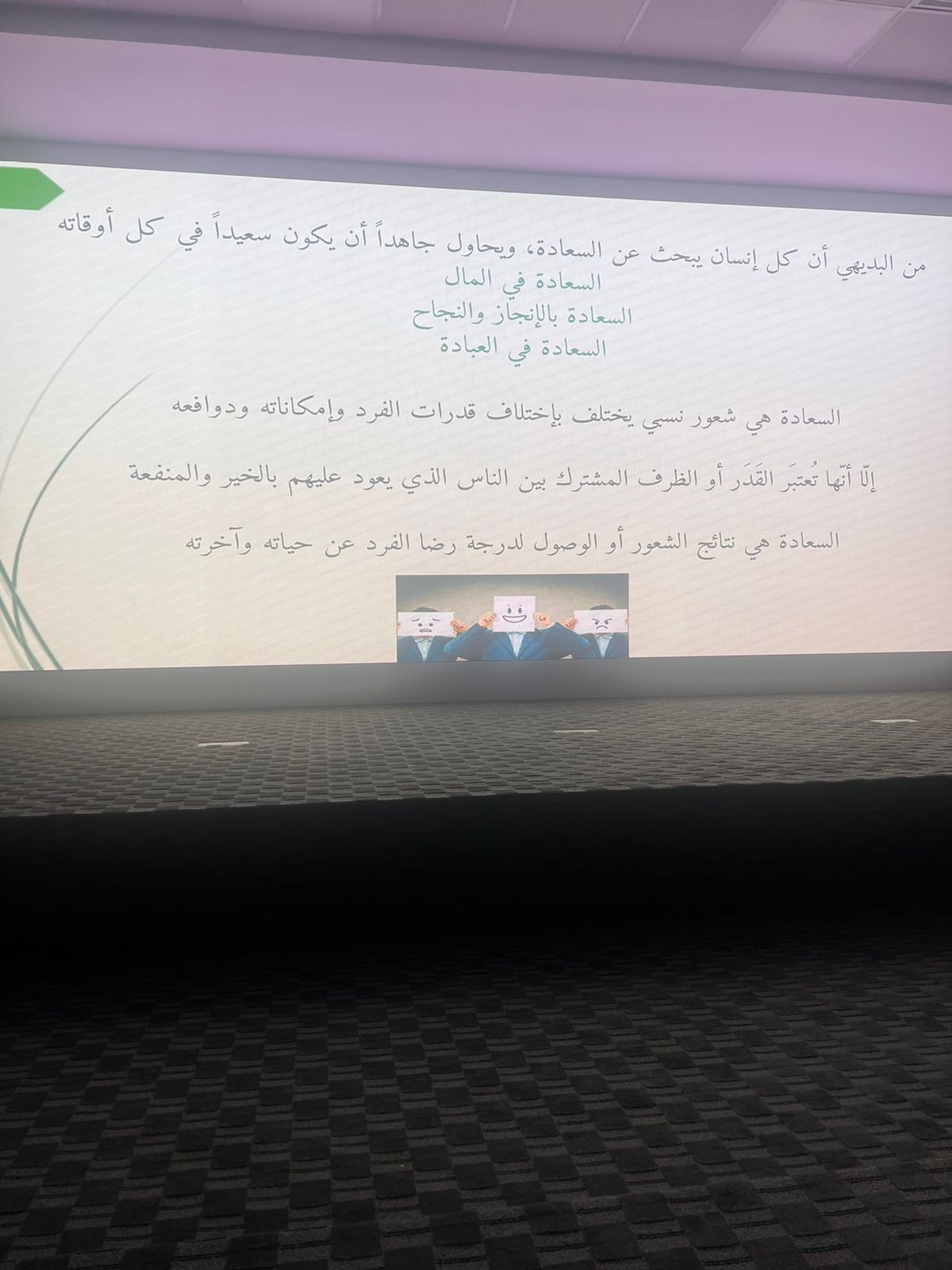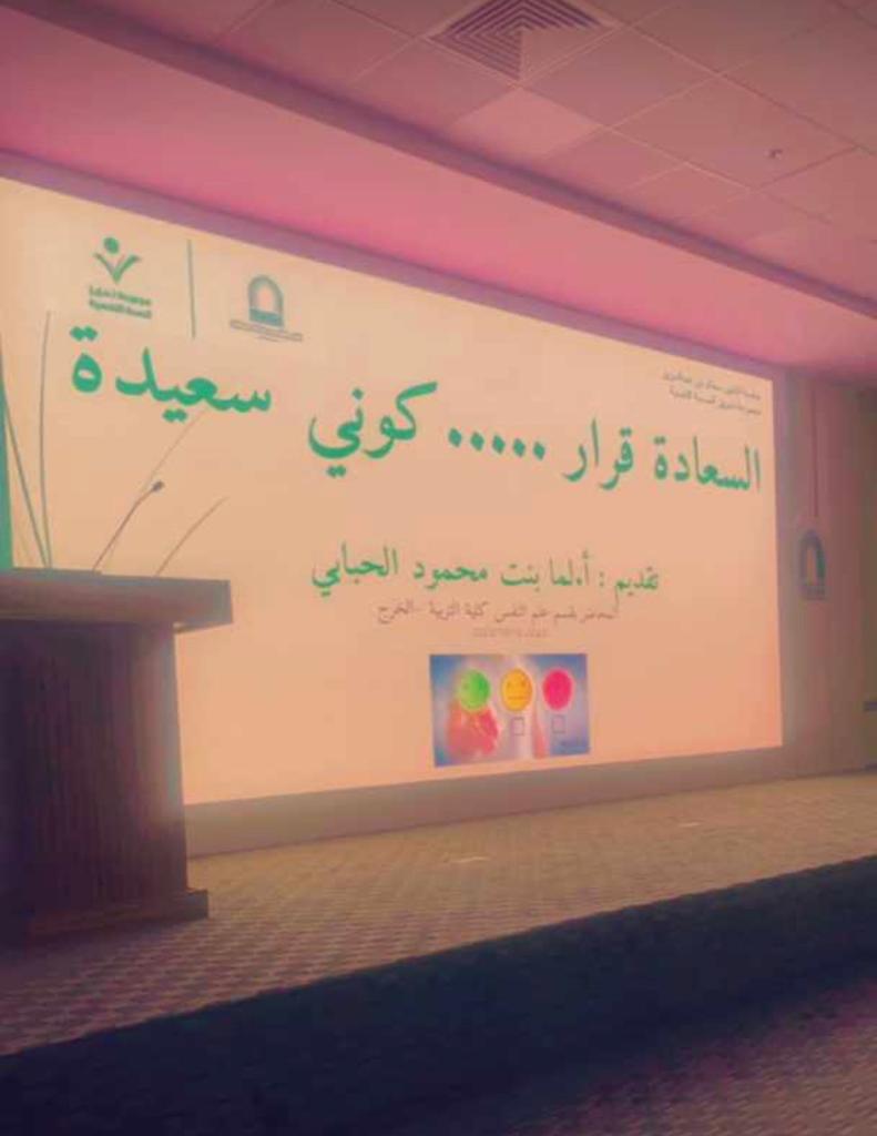 وقدمت مُحاضرة بعنوان (السعادة قرار) تناولت فيها العديد من المواضيع من أهمها قواعد السعادة والتوعية بأمراض الصحة النفسية المختلفة مثل الاكتئاب والقلق والتوتر وكيفية التعامل معها، وخلال المُلتقى تم تنظيم ورش عمل تفاعلية للمشاركين لتطبيق المفاهيم التي تم تقديمها في المحاضرة، وقد حضر الملتقى عددًا من منسوبات الكلية من أعضاء هيئة تدريس وإداريات وطالبات .