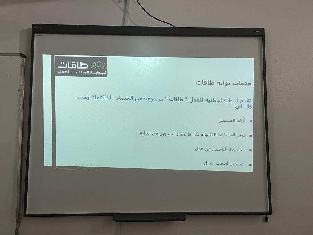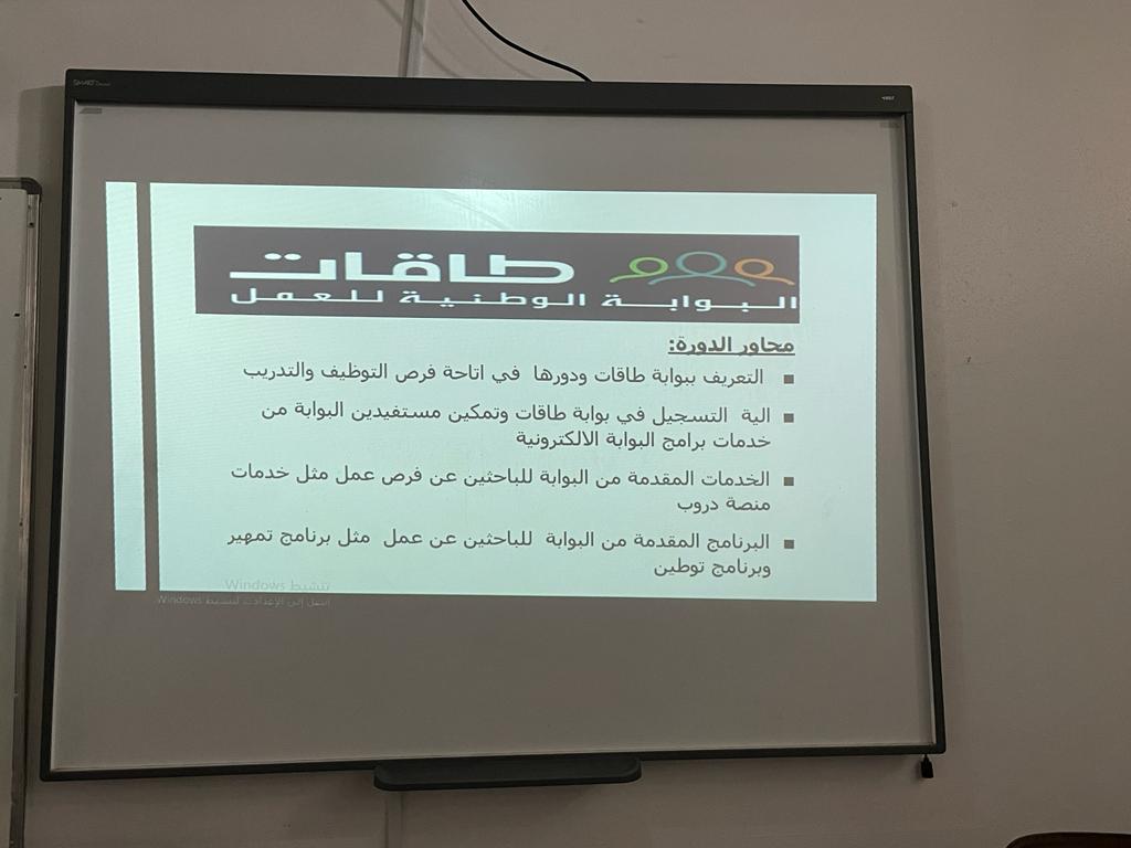 دارت محاور اللقاء حول التعريف ببوابة طاقات ودورها في إتاحة فرص التوظيف والتدريب ، وكذلك آلية التسجيل في البوابة وتمكين المستفيدين من خدماتها الإلكترونية ، تطرقت بعدها إلى الخدمات المقدمة من البوابة للباحثين عن فرصة عمل مثل خدمات منصة ( دروب ) ، واختتمن اللقاء بذكر البرامج المقدمة للباحثين عن عمل كبرنامج ( تمهير و توطين ) .
