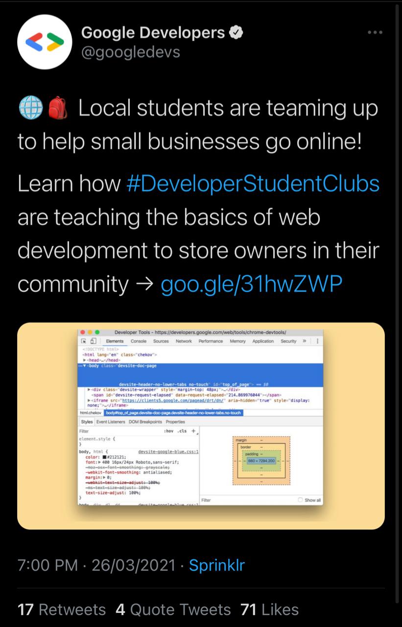 سلط موقع Google Developers Blog الخاص بالمطورين الطلبة على مستوى العالم الضوء على قصة نجاح نادي الطلبة المطورين بكلية هندسة وعلوم الحاسب من خلال إقتصاصه لصورة المبادرة التي أقامها النادي خلال فترة سابقة بعنوان Small businesses improving ليعد بذلك من أوائل الأندية السعودية والعربية الذي تُنشر قصة نجاحه.