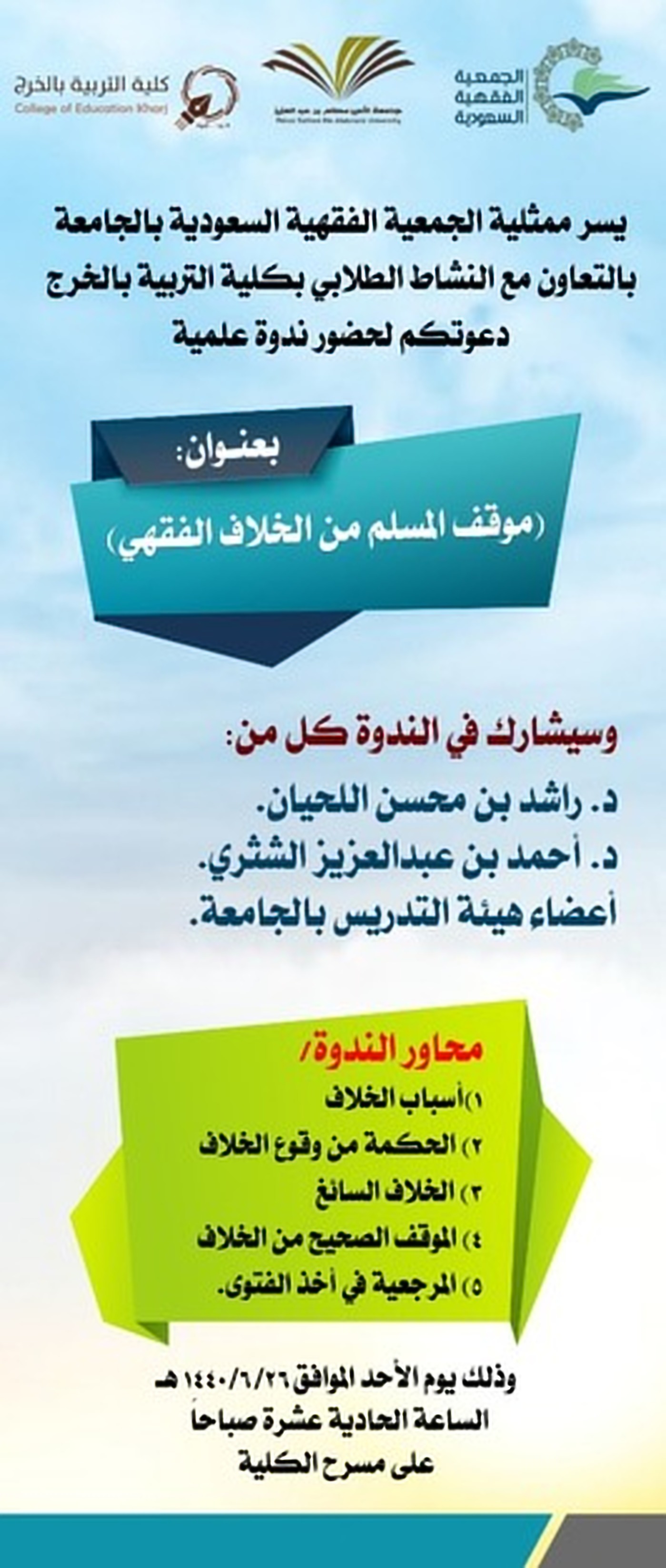 يسر ممثلية الجمعية الفقهية السعودية بالجامعة بالتعاون مع النشاط الطلابي بكلية التربية بالخرج دعوتكم لحضور ندوة علمية بعنوان (( موقف المسلم من الخلاف الفقهي )) يقدمها كلا من :