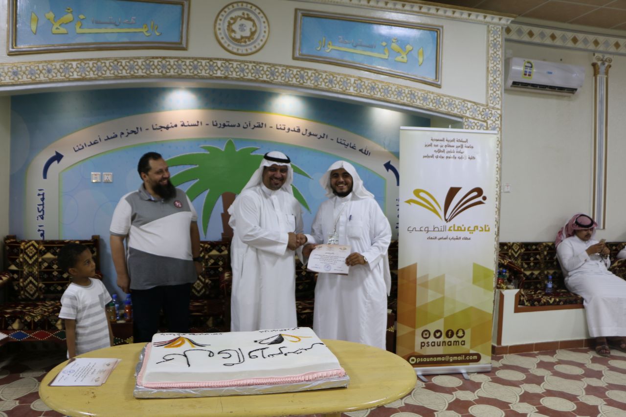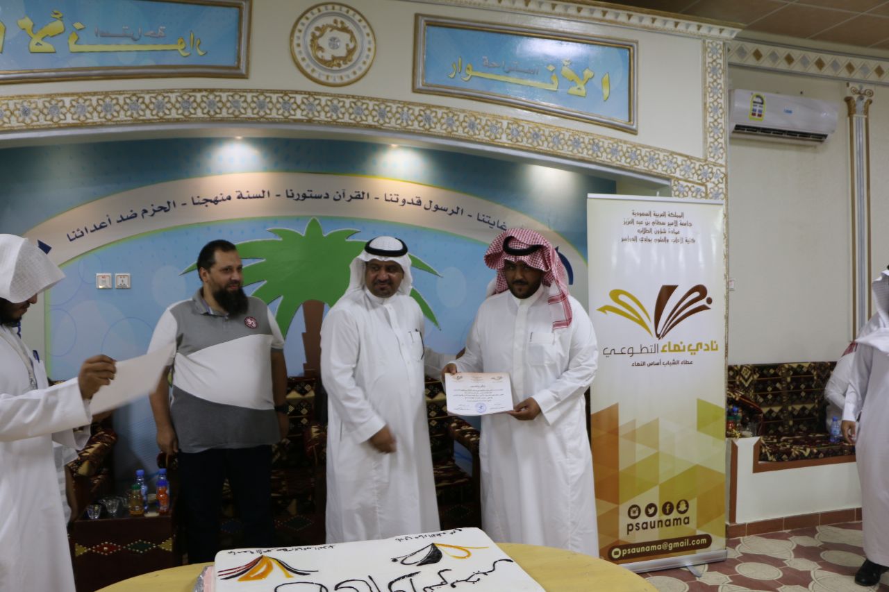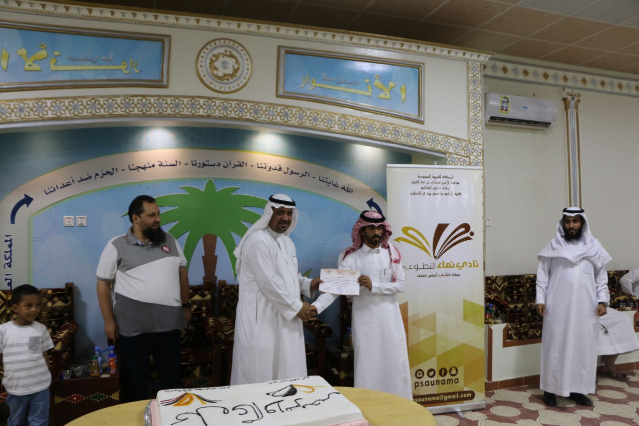 بحضور عميد كلية الاداب والعلوم د. سفر بن بخيت المدرع ومساعد العميد للشؤون التعليمية د. أشرف فتوح والمشرف على فريق نماء التطوعي الأستاذ / مسيب بن علي الوافي ومدير العلاقات العامة الأستاذ / نايف بن محمد آل نايف ، تم تكريم أعضاء فريق نماء التطوعي بالكلية التابع لعمادة شؤون الطلاب بالجامعة نظير ما قدمه الفريق من مبادرات خلال شهر رمضان المبارك ولقد أشاد المدرع بالمبادرات وهي ( جرب تصم - عيادة المرضى - عابر سبيل - مساجدنا أولى - عيدنا غير ) .