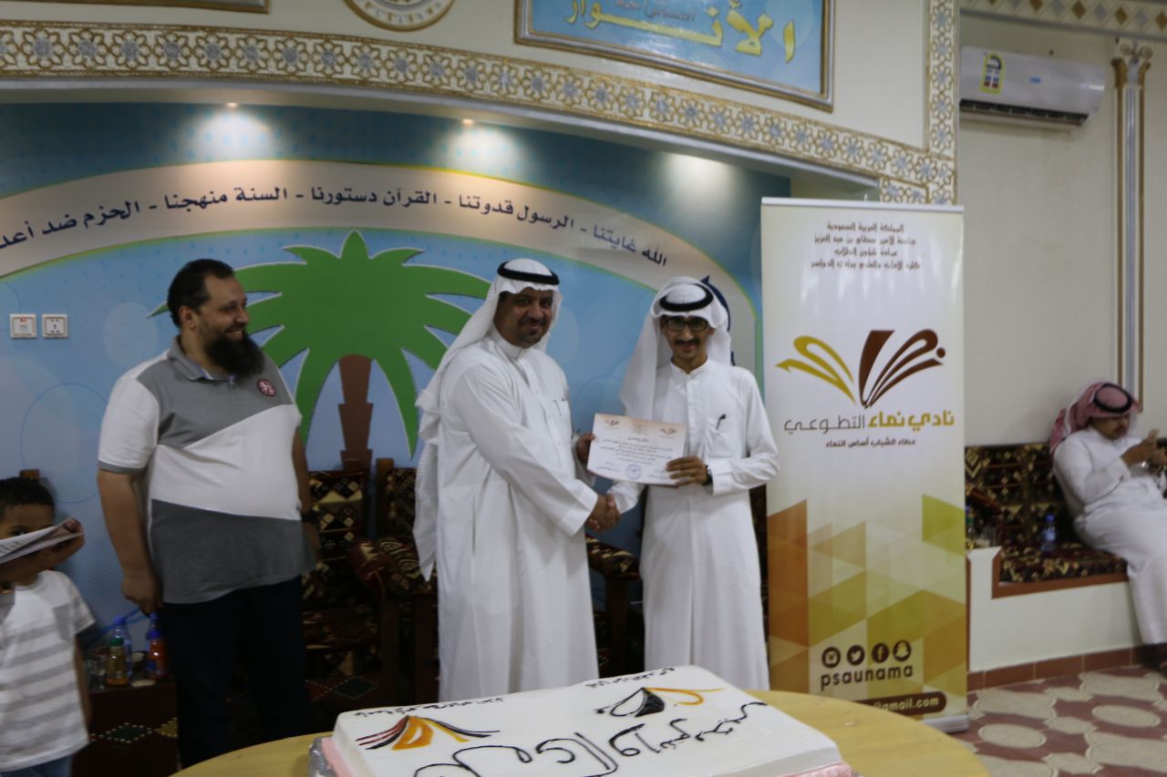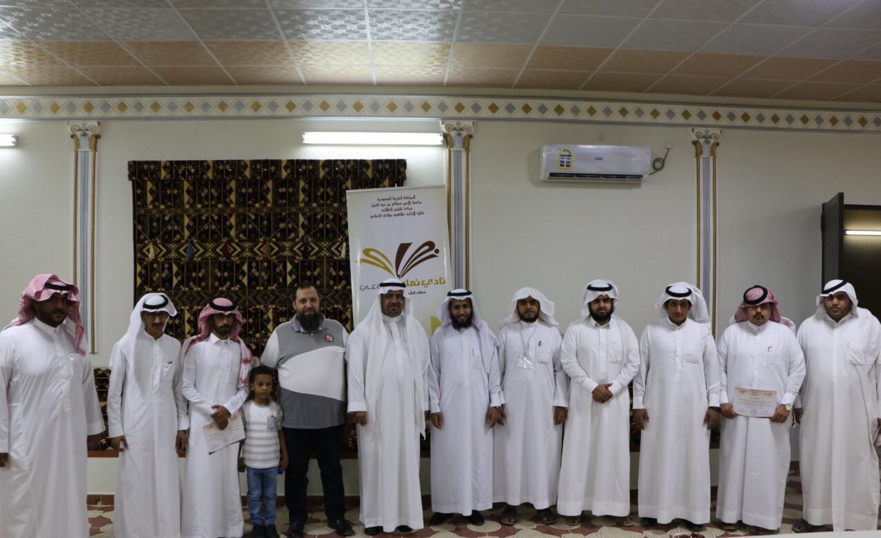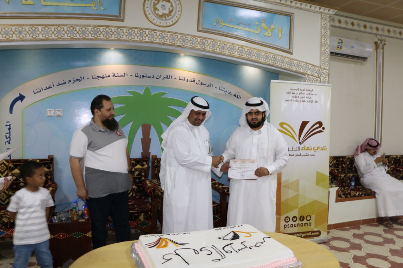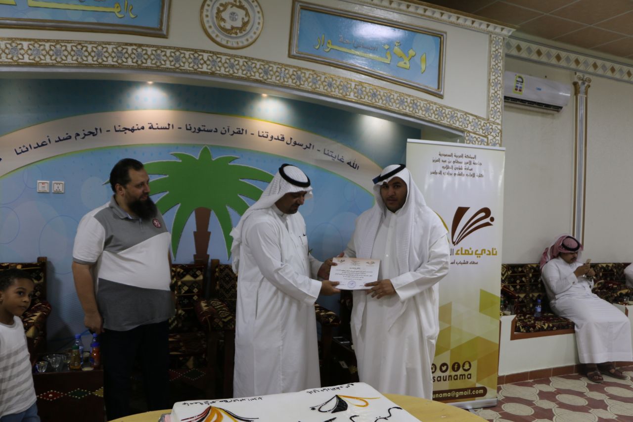 بحضور عميد كلية الاداب والعلوم د. سفر بن بخيت المدرع ومساعد العميد للشؤون التعليمية د. أشرف فتوح والمشرف على فريق نماء التطوعي الأستاذ / مسيب بن علي الوافي ومدير العلاقات العامة الأستاذ / نايف بن محمد آل نايف ، تم تكريم أعضاء فريق نماء التطوعي بالكلية التابع لعمادة شؤون الطلاب بالجامعة نظير ما قدمه الفريق من مبادرات خلال شهر رمضان المبارك ولقد أشاد المدرع بالمبادرات وهي ( جرب تصم - عيادة المرضى - عابر سبيل - مساجدنا أولى - عيدنا غير ) .