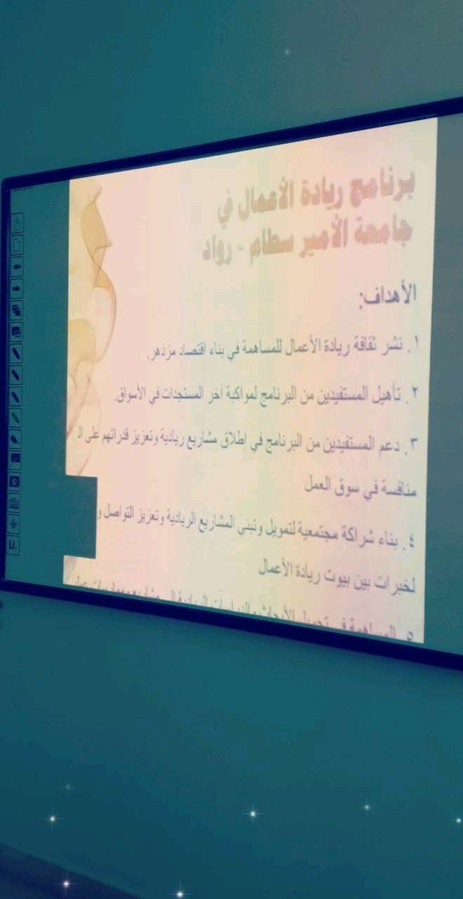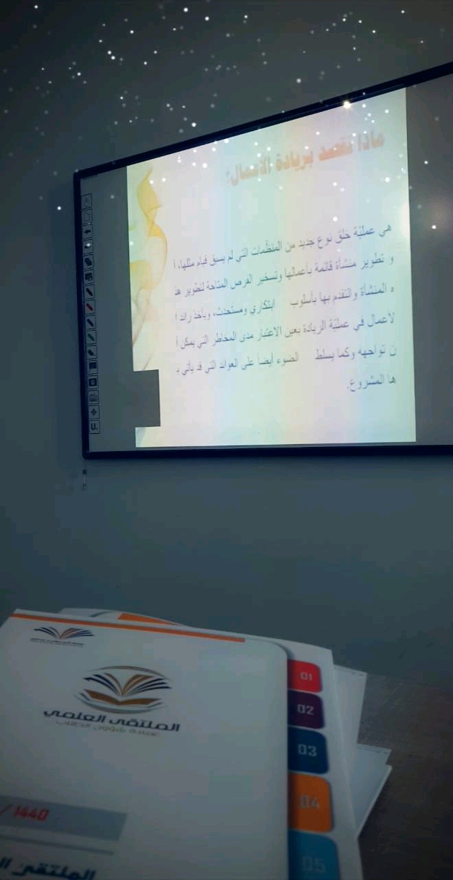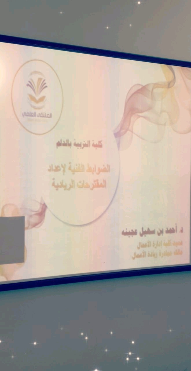 شرف البرنامج التدريبي للملتقى العلمي الثالث ( القمة هدفنا والجودة عنواننا ) اليوم الخميس الموافق: 18 / 5/1440هـ بسعادة الدكتور : أحمد عجينة عميد كلية إدارة الأعمال بجامعة الأمير سطام بن عبدالعزيز لتنفيذ ورشة ( الضوابط الفنية لإعداد المقترحات الريادية ) ضمن برامج محور ريادة الأعمال ، حيث تطرق سعادته لطرق إعداد مشاريع ريادية بضوابط فنية وابداعية.