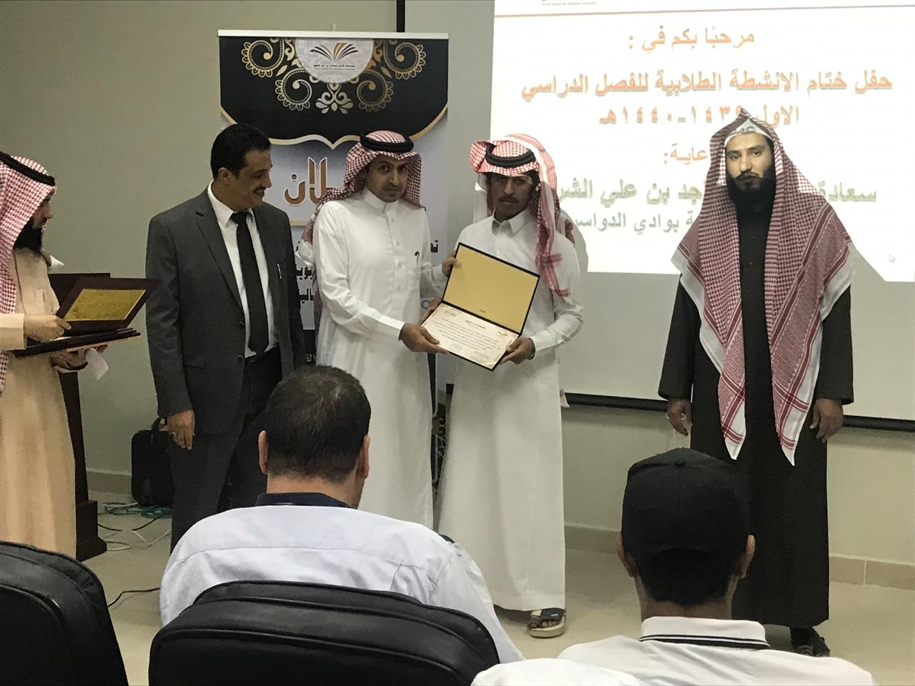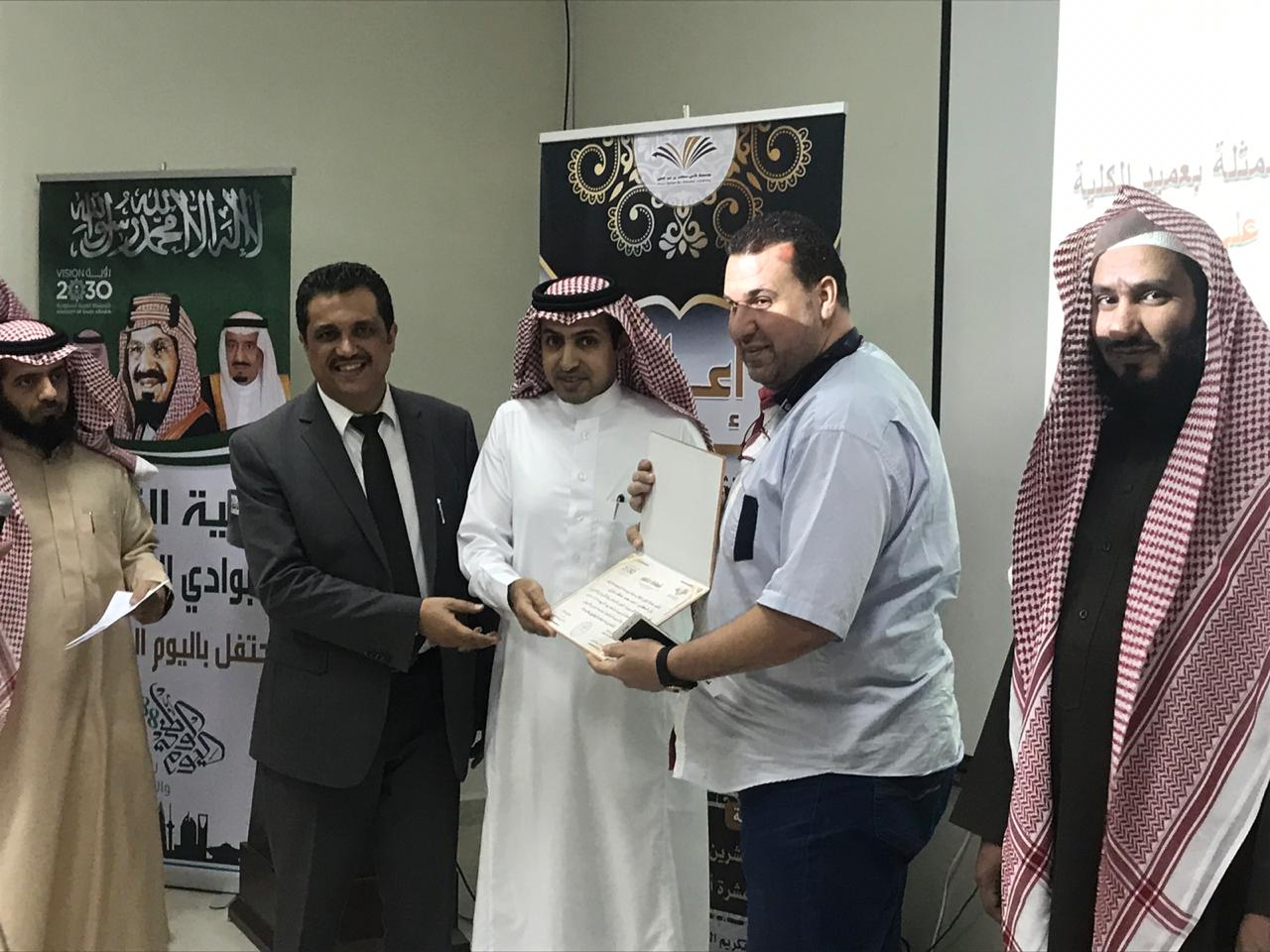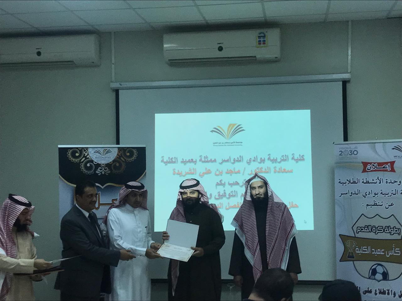 سلم عميد كلية التربية بودي الدواسر الدكتور ماجد بن علي الشريدة ، في مسرح الكلية اليوم الأربعاء الموافق 1440/3/27هـ ، شهادات حضور الدورة التدريبة التي أقامتها الكلية مؤخراً " مهارات التعامل والتأثير في الاخرين" وذلك بالتعاون مع وحدة التوجيه والإرشاد بعمادة شؤون الطلاب بجامعة الأمير سطام بن عبدالعزيز لعددٍ من منسوبي الكلية والتي عُقدت بقاعة التدريب بالكلية .