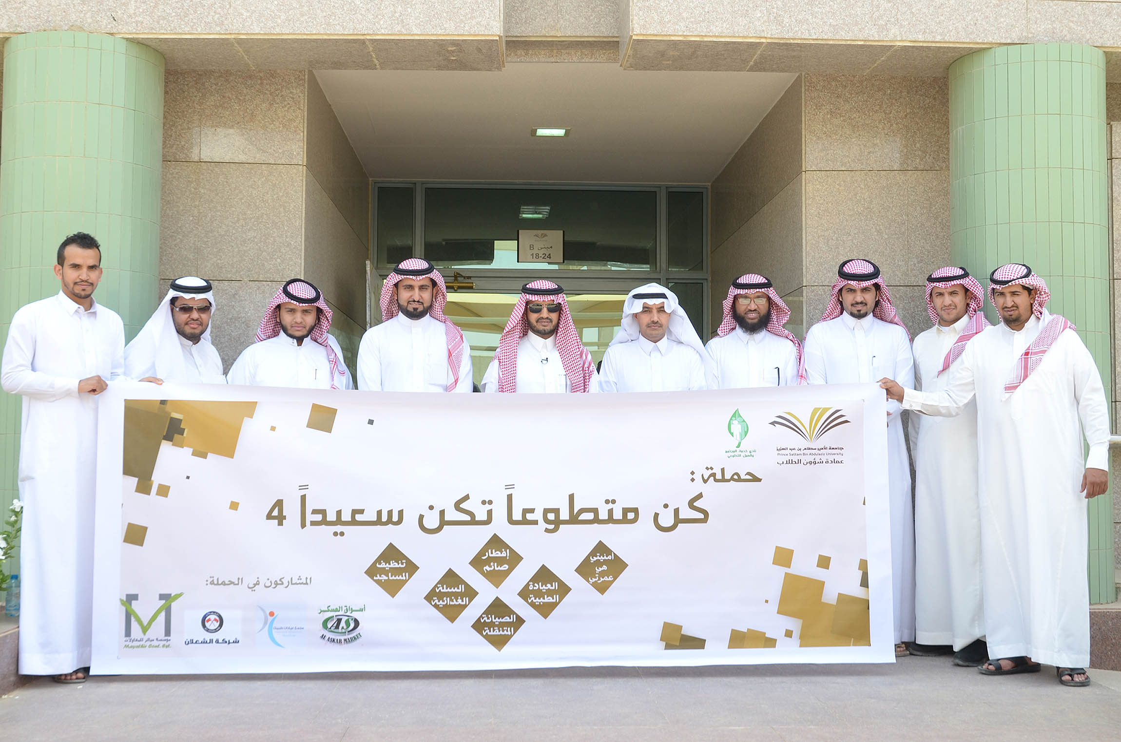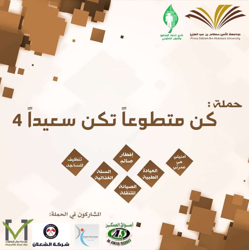 دشن عميد شؤون الطلاب بجامعة الأمير سطام بن عبدالعزيز الدكتور مسفر بن محماس الكبيري صباح يوم الخميس ١٤٣٧/٨/٢٨هـ أمام مبنى العمادة بالمدينة الجامعة بالسيح حملة " كن متطوعآ تكن سعيداً" في نسختها الرابعة ، والتي ينظمها نادي خدمة المجتمع والعمل التطوعي بعمادة شؤون الطلاب وتستمر لعدة أيام .