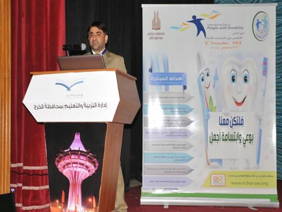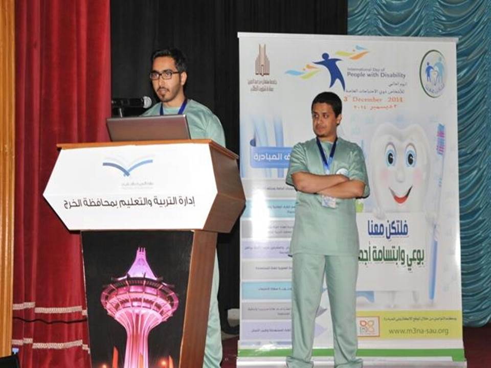 بمتابعه ودعم من عميد شؤون الطلاب بجامعة سلمان بن عبدالعزيز سعادة الدكتور/ مسفر محماس الكبيري أقيمت مبادرة تحت عنوان تكن معنا في المدارس التي تحوي فئات الاحتياجات الخاصة بالخرج. المبادرة تستهدف المبادرة شريحة غالية على المجتمع ((ذوي الاحتياجات الخاصة )) بشكل عام في المدارس الحكومية التي تحتوي برامج للتربية الخاصة وتفاعلاً مع اليوم العالمي للأشخاص ذوي الاحتياجات الخاصة أقيمت فعالية لإبراز هذه المبادرة وهذا الحدث العالمي في قاعة الأمير عبدالرحمن بن ناصر للأنشطة التربوية والتعليمية بإدارة التربية والتعليم بمحافظة الخرج بحضور سعادة عميدة شؤون الطلاب د مسفر محماس الكبيري ومدير ادارة التربية والتعليم د زيد الجليفي ومساعد مدير التربية والتعليم للشؤون التعليمية الأستاذ خالد بن مساعد الحربي , ومساعد مدير التربية والتعليم للشؤون المدرسية الدكتور صالح بن بخيت الدويلة ,والأستاذ المشارك المنسق لأعمال المؤتمر العلمي السادس بكلية طب الأسنان محمد عبدالحكيم الشال وعدد من منسوبي ادارة التربية والتعليم ومديري المدارس ومعلمي وطلاب برامج التربية الخاصة بدأت المناسبة بآيات من الذكر الحكيم , ثم ألقى الأخصائي بكلية طب الأسنان و المشرف على مبادرة لتكن معنا د ألطف حسين شاه كلمة بين فيها ضرورة صحة الفم والأسنان خصوصا في ضل وجود دراسات عديدة أثبتت وجود حاجة ماسة لجملة من البرامج الوقائية والأولويات التوعوية والتطبيقية المستدامة في هذا المجال وخصوصا لدى الأطفال ويأتي في مقدمتها أصحاب الاحتياجات الخاصة بشكل خاص خصوصا أنهم يعانون من شح مثل هذه البرامج ودعى إلى ضرورة تخطي العقبات وكسر جميع الحواجز الاجتماعية وابراز واستهداف اصحاب الاحتياجات الخاصة بشكل واسع ودمج مفهوم صحة الفم والأسنان مع هذه الفئة " ثم علق عضو المبادرة طبيب الامتياز حسام سليان الماضي على كلمة المشرف العام وتحدث بأن صحة الفم والأسنان هي مسؤولية تقع على عاتق أصحاب الاختصاص وعلى المجتمع , وأصحاب الاحتياجات الخاصة شريحة في غاية الأهمية فهم جزء لا يتجزأ من مجتمعنا الغالي. وأعرب بأن رسالة هذه المبادرة تكمن بجعل صحة الفم والأسنان بشكل عام وأصحاب الاحتياجات الخاصة بشكل خاص أولوية من أوليات المجتمع السعودي ( اجتماعياً ، ثم تطبيقياً ) وتهيئة المجتمع للمشاركة بشكل أكثر فعالية في تحقيق هذا المفهوم غير أن تحقيق هذه الرسالة مسؤولية الجميع من قطاعات حكومية وأهلية ومؤسسات مدنية و طلب باسم فريق المبادرة إلى التجاوب السريع مع هذه المبادرة . ثم قدم عضو المبادرة طبيب الامتياز فارس يحيى عسيري عرض تقديمي للمبادرة وتعريفا خاصا بالحدث العالمي ووصف هذه المبادرة بأنها عبارة عن مبادرة إنسانية تطوعية واستراتيجية اجتماعية أخلاقية مسؤولة تسعى لتكوين لبنة في تاريخ المسؤولية الاجتماعية في مجال صحة الفم خلال خمس مراحل رئيسية وكانت بدايتها وتطبيقها في مجتمعنا المحلي في محافظة الخرج كلبنة أساسية تأخذها بإذن الله للانطلاق بها وتعميمها في جميع أجزاء المملكة العربية السعودية ودعى لمشاركة الخبرات وتقديم الاقتراحات والتواصل من خلال الموقع الاكتروني للمبادرة www.m3na-sau.org تلا ذلك تقديم عرض مرئي وتقرير عام للتعريف بمبادرة «لتكن معنا» تضمن استعراض مراحل المبادرة وتستعرض ما تم إنجازه من أعمال وتتحدث عن الأهداف المرجوة منها التي وصفها التقرير المرئي بأنها تتماشى مع الخطط العامة لبلدنا الغالية وقيادتها الراشدة التي تركز على العمل الإنساني والرقي بصحة المجتمع . ومن بينها: رسم ثقافة العمل الإنساني والتوعوي المستدام والخروج من دائرة العمل المنقطع، تعزيز قيمة الشعور بالمسؤولية الاجتماعية تجاه فئة ذوي الإعاقة الغالية على المجتمع، إشعار ذوي الإعاقة باهتمام المجتمع بهم نظراً لقلة المشاريع التوعوية التي تستهدفهم في مجال صحة الفم والأسنان، رسم ثقافة المبادرة وتعميق روح العمل التطوعي المؤسسي، توفير شراكات حقيقية من مختلف قطاعات المجتمع لد