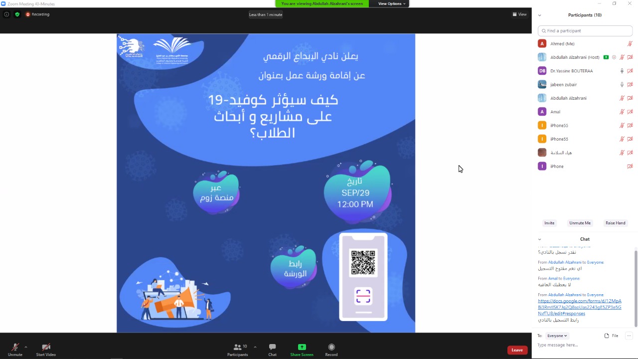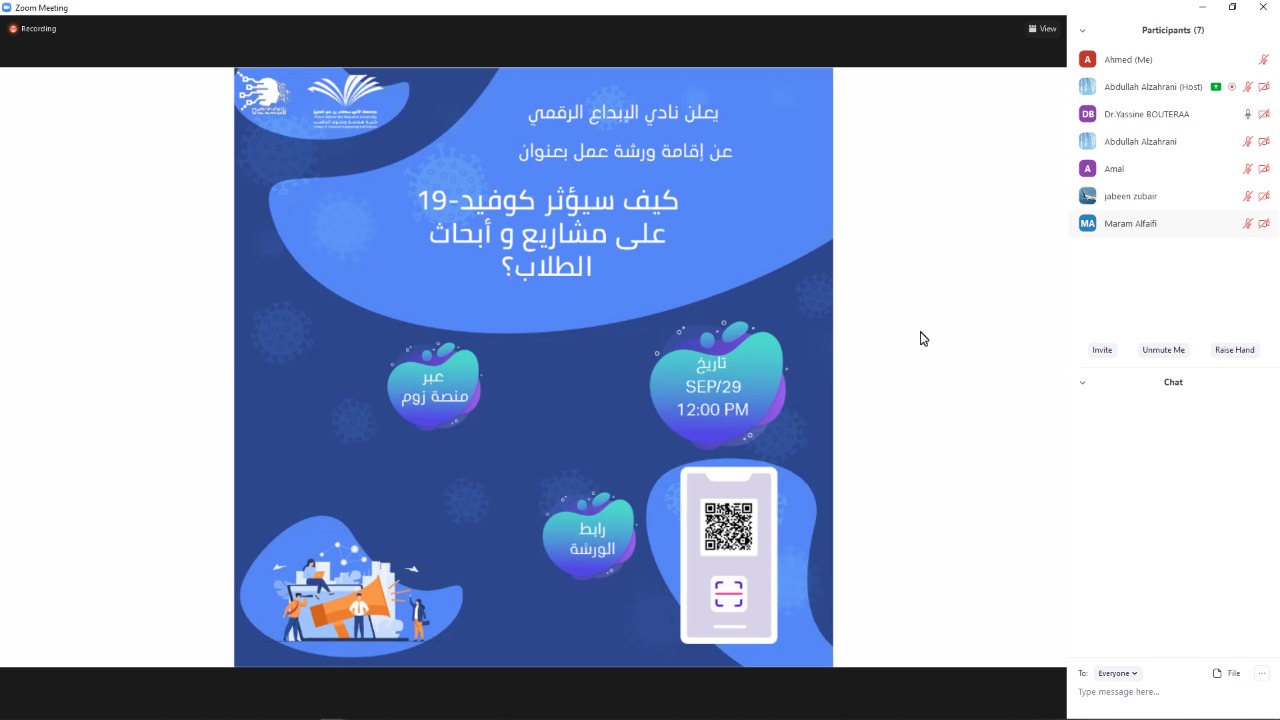 حيث اشتملت الورشة التي أقيمت عبر الإتصال المرئي في برنامج الـ zoom على تسليط الضوء ما بين طلاب وطالبات الكلية على تجاربهم وحلولهم أثناء عملهم على المشاريع والأبحاث الطلابية إثر فترة تعليق الدراسة حضوريًا إبان ذروة جائحة فيروس كورونا المستجد كوفيد 19 والحلول الممكنة لإنجاز مشروعاتهم منزلياً أونلاين في هذا العام عن بقية زملائهم في السنوات السابقة وإتخاذ القرار العاجل في الحصول على خيارات بديلة وبإستخدام الحلول ذات التكنولوجيا المتقدمة كـ الإستعانة بمصادر التعلم والتعليم عن بعد للتخفيف من فقدان التعلم من خلال استخدام منصات التعلم الرقمي المتكاملة ودروس الفيديو من أجل التغلب على أزمة التعلُّم التي نشهدها حالياً والتصدي للجائحة التي نواجهها جميعاً.