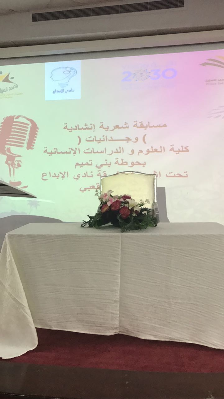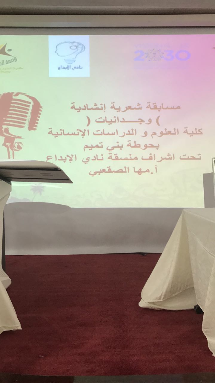 اقام نادى الإبداع بكلية العلوم والدراسات الإنسانية بحوطة بني تميم مسابقه شعرية بعنوان " وجدانيات" وذلك يوم الأثنين الموافق 9 /3 / 1439 هـ تحت إشراف الأستاذة مها الصقعبي وبحضور سعادة عميدة الكلية د حصة بنت سعود الهزانى. هدفت هذه المسابقة إلى إيثار مشاعر الطالبات بفكرة معينة يتم طرحها بصورة شعرية أو إنشادية تتعرف الطالبة من خلالها على عواطفها ومشاعرها بحيث تكون مصدر دافعية لذاتها وتتعرف على مشاعر الآخرين .