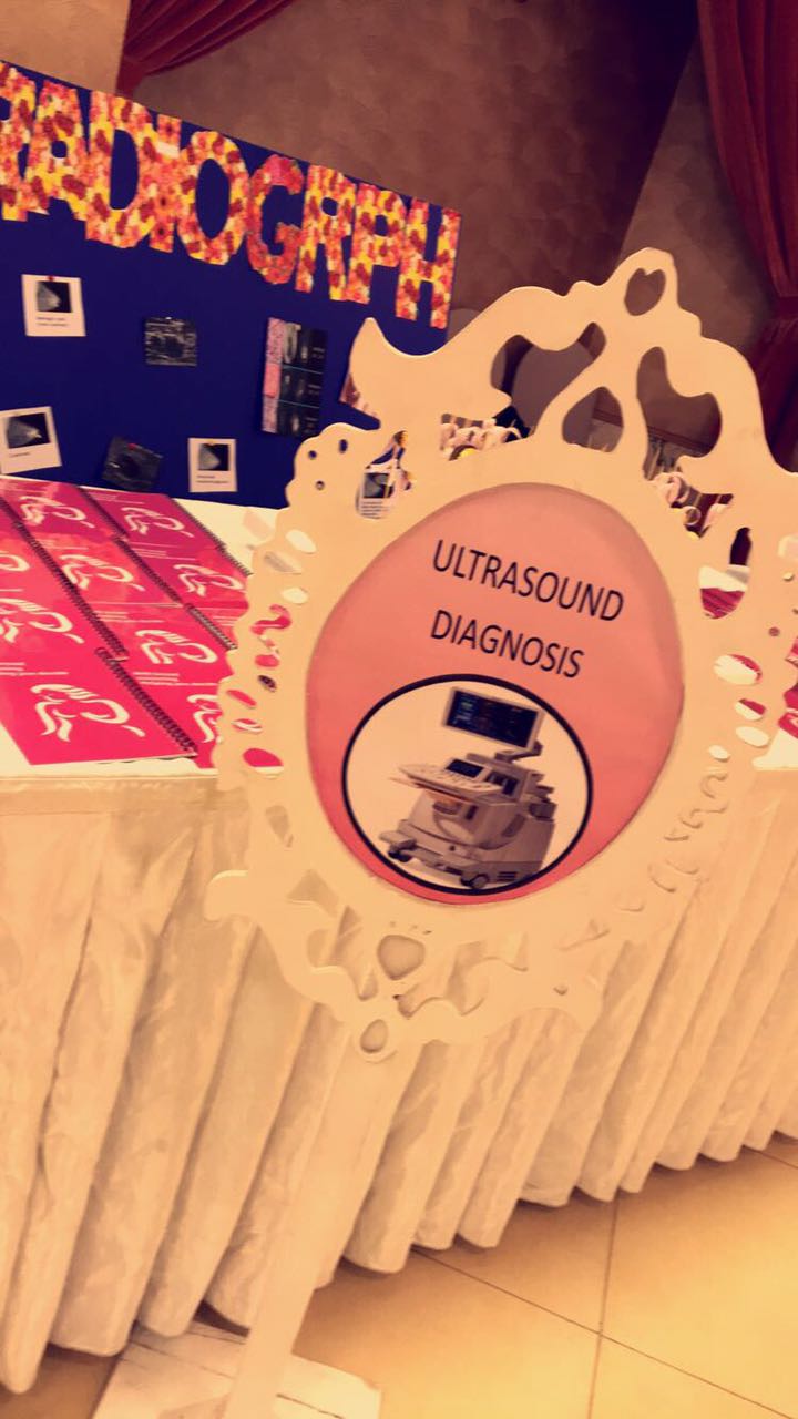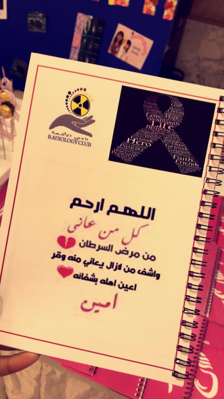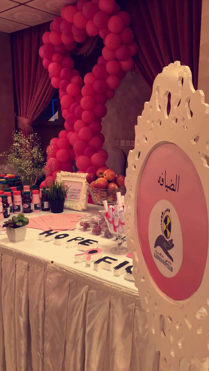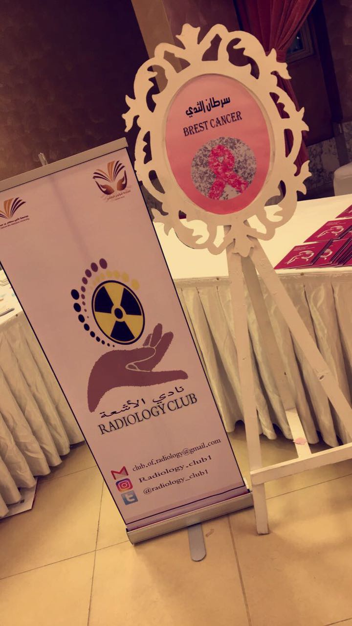 شارك نادي الأشعة بكلية العلوم الطبية التطبيقية (أقسام الطالبات ) ممثلاً للجامعة بالملتقى الحواري الثاني بعنوان(حملتنا الوردية برسالة توعوية ) للتوعية بسرطان الثدي وذلك مساء الخميس الموافق 1/19/ 1438هـ والمقام في فندف شمسة وبتنظيم من مجمعات التعاون الطبية .