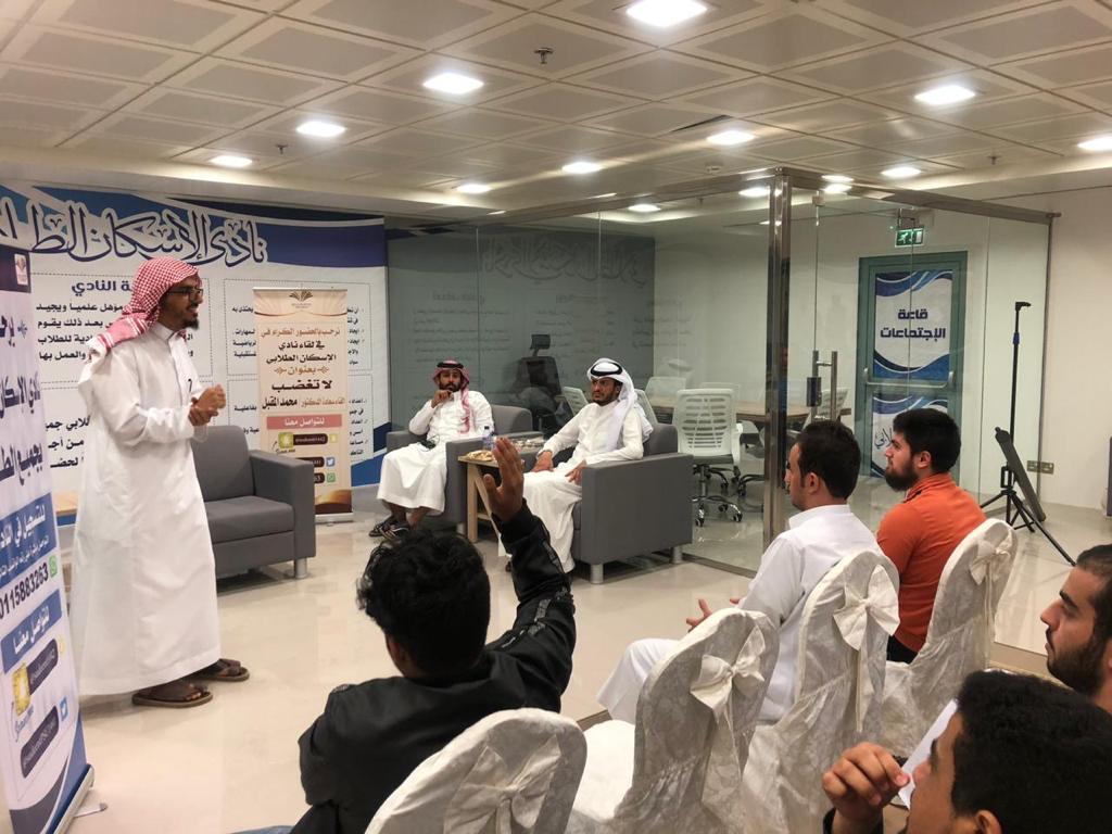بحضور وكيل عمادة شؤون الطلاب للخدمات الطلابية والإسكان الدكتور عبدالله بن سعود الشتيلي، نظم نادي الأسكان الطلابي مساء يوم الأثنين 30 / 6 / 1441هـ محاضرة بعنوان " لا تغضب" قدمها الدكتور محمد المقبل عضو هيئة التدريس بكلية التربية بالخرج.