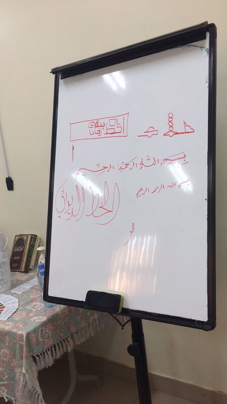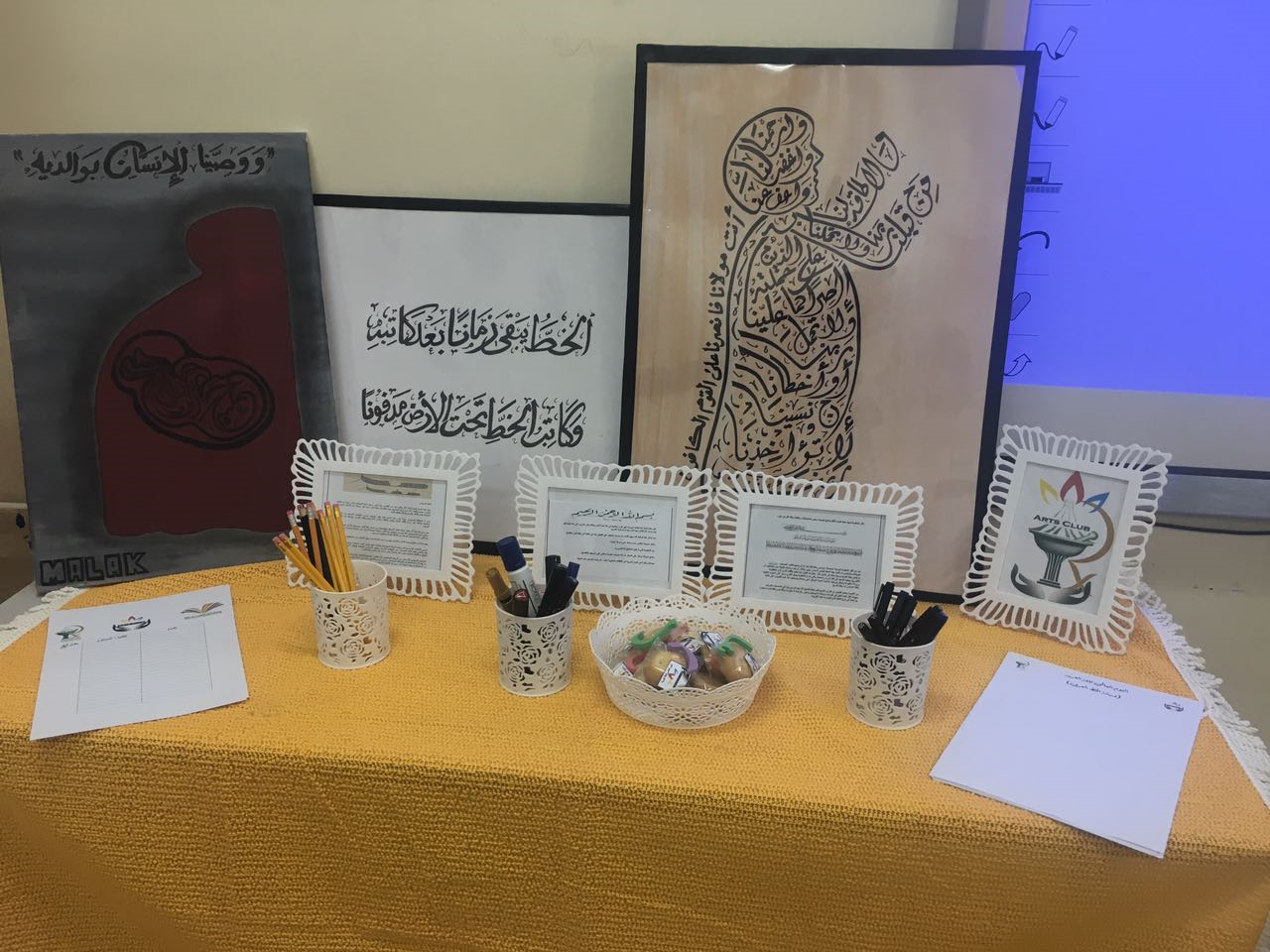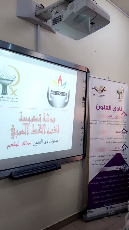 نظم نادي الفنون ورشة تعليمية عن أساسيات وأنواع الخط العربي وذلك بكلية الصيدلة شطر الطالبات في يوم الإثنين الموافق 27/4/1438 حيث قامت مديرة النادي الطالبة ملاك المقحم بشرح الأساسيات في كتابة الخط العربي من نسخ ورقعة وديواني وغيرها وذلك بالتطبيق العملي أمام الحاضرات بالإضافة الى مشاركة الحاضرات في كتابة بعض الجمل وتحسين طريقة كتابتهن ومساعدتهن ببعض النصائح والإرشادات ،كما قامت كلاً من الطالبتين : لطيفة التركي , شادن الدوسري في عمل ركن إضافي عرضت فيه نماذج لأنواع هذه الخطوط ومنشورات عنها وقد حازت الورشة على رضا وإعجاب الحاضرات