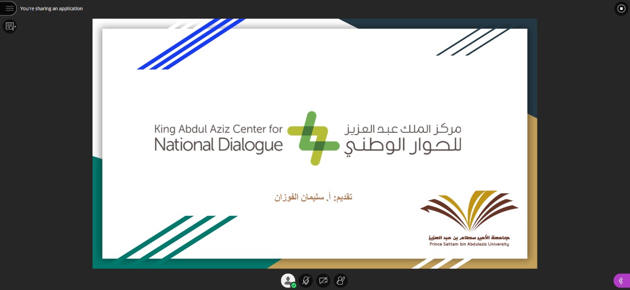 نظم نادي الحوار بكلية إدارة الأعمال لقاء تعريفي عن مركز الملك عبدالعزيز للحوار الوطني ودوره في خدمة المجتمع وذلك يوم الاربعاء 7/4/2021م. حيث قدم اللقاء أ. سليمان الفوزان المحاضر بقسم المحاسبة بالكلية وكان ذلك عبر خدمة القاعات الافتراضية. وقد هدف اللقاء إلى تعريف الطلاب والطالبات بمركز الملك عبدالعزيز للحوار الوطني، والخدمات والبرامج التي يقدمها المركز للشباب والشابات. كما تم إقامة حلقات نقاش بأهمية دور المركز وكيفية الاستفادة من خدماته للطلاب الجامعيين.