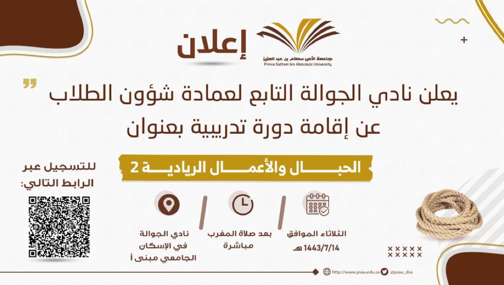 أقام نادي الجوالة بعمادة شؤون الطلاب مساء يوم الثلاثاء 14/07/1443 دورة الحبال والأعمال الريادية الثانية؛ قدمها القائد الكشفي/ فهد بن سليمان العتيبي.