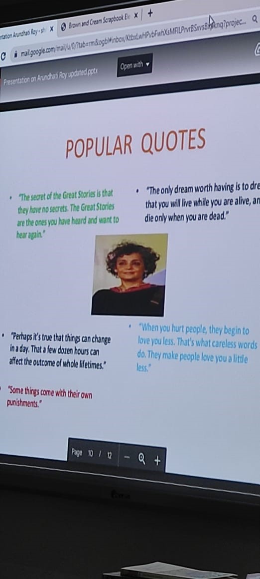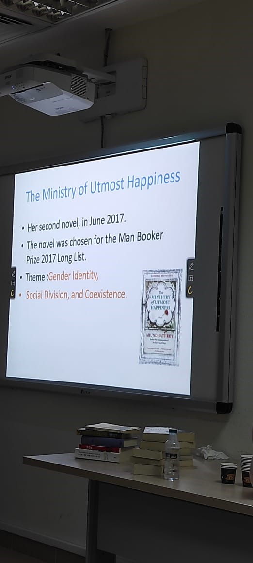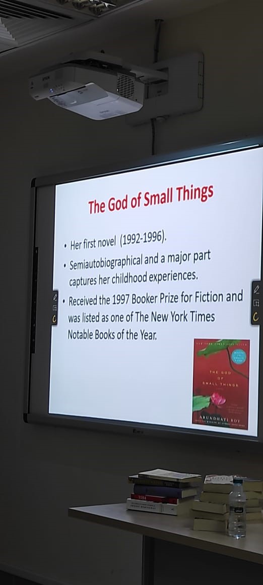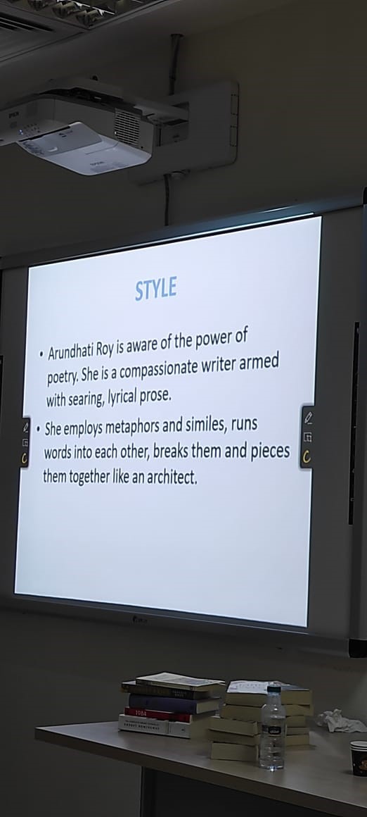 حيث كانت الدكتورة شيفان هي الضيف المتحدث في هذا الاجتماع وقد شاركت أفكارها حول الكاتبة المختارة أرونداتي روي وبدأت عرضها بالاقتباس كما قال بيكون (بعض الكتب يجب تذوقها، والبعض الآخر يتم ابتلاعه، والبعض الآخر يتم مضغه وهضمه) أوضحت خلفية الكتاب ونوع الكتابة كذلك التركيز على الجوانب المختلفة لفكر الكتاب في المساواة وحقوق الطفل وضد التمييز ضد المرأة.