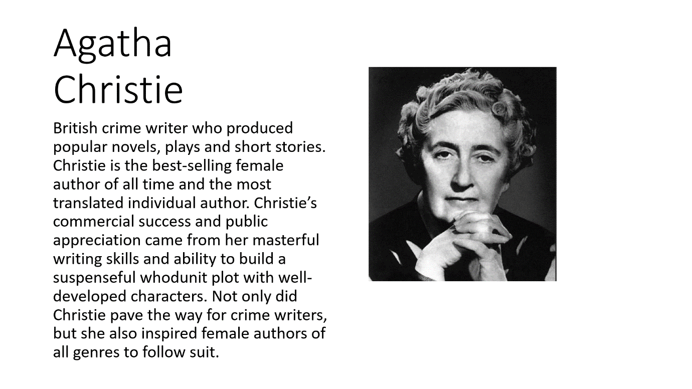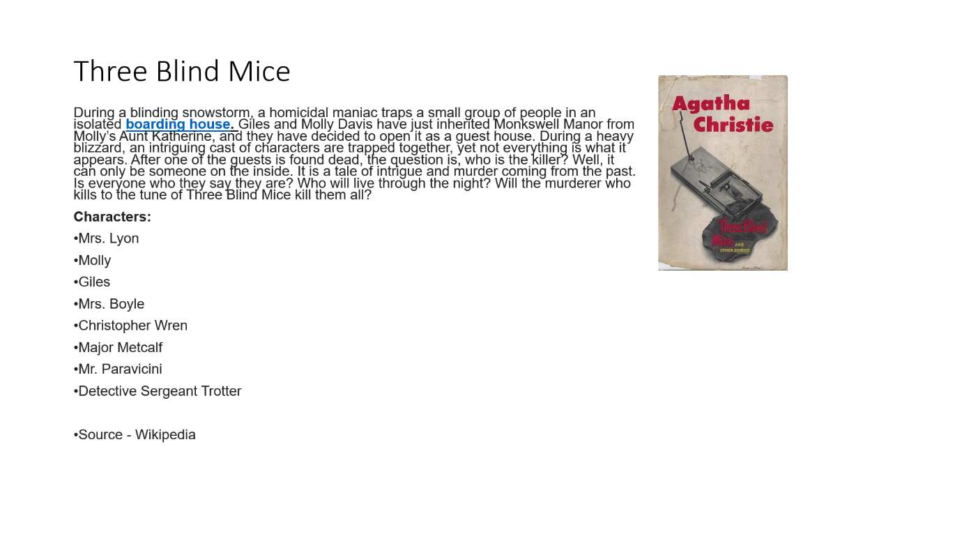 حيث تمت مناقشة الخطة القادمة للإجراءات وتم تحديد القصة التي ستُقرأ في الأسبوع التالي وهي قصة "ثلاثة فئران عمياء" وقد تمت مناقشة خلفية الكاتب، كما تمت مناقشة الشخصيات والخطوط العريضة للقصة.