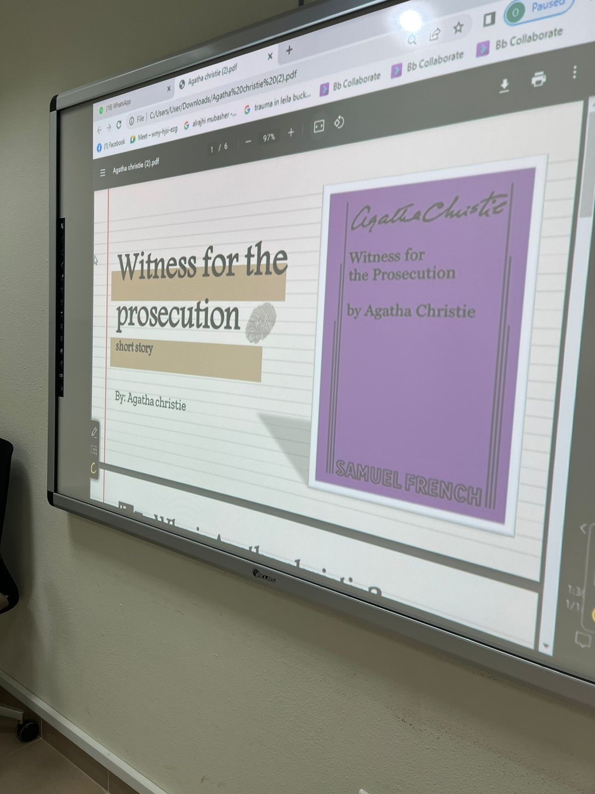 حيث قامتا الطالبتان في إبراهيم الدغفق ومساهر إبراهيم الشهراني بتقديم رواية (شاهد النيابة) وتم عرض خلفية للكاتبة أجاثا كريستي وانتقلوا إلى سرد الشخصيات الرئيسية، بعد ذلك لخصوا الرواية وتحدثوا عن ملامح الرواية التي أعجبتهم أكثر وأيضًا ناقشوا أعظم أعمال أجاثا كريستي باعتبارها ثالث أكثر الأعمال شعبية في الأدب الإنجليزي.