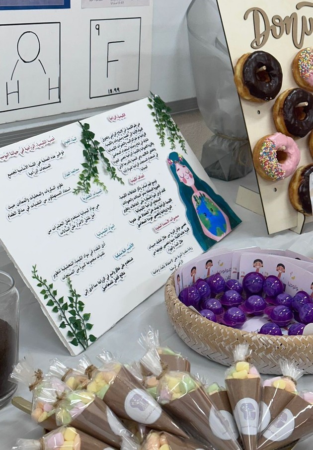 وﺗﻀﻤﻨﺖ اﻟﺰﻳﺎرة وﺟﻮد رﻛﻦ ﻋﻦ اﻟﻜﻴﻤﻴﺎء اﻟﻌﺎﻣﺔ اشتمل على (اﻟﻜﻴﻤﻴﺎء اﻟﺰراﻋﻴﺔ، واﻟﻜﻴﻤﻴﺎء اﻟﻔﻠﻜﻴﺔ، وﻛﻴﻤﻴﺎء اﻟﻤﺎء، وﻛﻴﻤﻴﺎء اﻟﻘﻬﻮة،واﻟﺘﺠﺎرب)، ﻛﻤﺎ ﻗمن طالبات النادي ﺑﻌﻤﻞ ﻧﺸﺎط وﺗﻘﺪﻳﻢ ﻋﺮض ﻓﻲ ﻣﺴﺮح اﻟﻤﺪرﺳﺔ، حيث ﺑﺪأ اﻟﻌﺮض ﺑﻤﻘﺪﻣﺔ ﺗﺮﺣﻴﺒﻴﺔ ﺑﺎﻟﺤﺎﺿﺮﻳﻦ والشكر لإتاحة ﻫﺬه اﻟﺰﻳﺎرة، ﺑﻌﺪ ذﻟﻚ ﻗﺮأت إﺣﺪى ﻃﺎﻟﺒﺎت اﻟﻤﺪرﺳﺔ اﻟﻘﺮآن اﻟﻜﺮﻳﻢ، ﺛﻢ ﺑﺪأ ﺑﺎﻟﺘﻌﺮﻳﻒ ﻋﻦ اﻟﻜﻴﻤﻴﺎء ﺑﺎﻟﺤﻴﺎة وﻓﺮوﻋﻪ ﺑﺸﻜﻞ ﻣﺒﺴﻂ، ﺑﻌﺪ ذﻟﻚ ﻓﻘﺮة ﺗﻌﺮﻳﻔﻴﺔ قدمتها ﻃﺎﻟﺒﺎت اﻟﻤﺪرﺳﺔ ﻋﻦ أﺷﻬﺮ اﻟﻌﻨﺎﺻﺮ اﻟﻜﻴﻤﻴﺎﺋﻴﺔ، ﺛﻢ أﺟﺮوا ﺑﻌﺾ اﻟﺘﺠﺎرب أﻣﺎم اﻟﺤﻀﻮر،