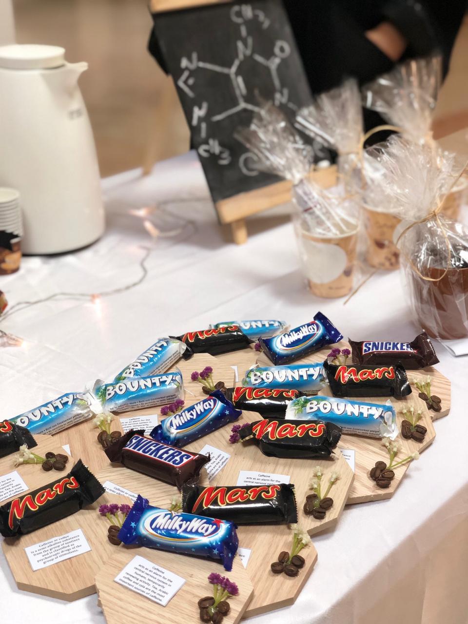 - ففي يوم الأحد كان النشاط عن مادة الكافيين تم فيه التعريف بمادة الكافيين وأماكن تواجدها في كثير من أنواع النباتات، وكما توجد نسب عالية من مادة الكافيين في التربة المحيطة بشتلات حبة البن، أيضًا هناك مصادر مشتركة بين الكافيين والقهوة والشاي التي تتواجد في الشكولاتة مثل: الريد بول والمشروبات الغازية مثل الكولا كما تتواجد في بعض الأدوية لعلاج انقطاع التنفس لأطفال حديثي الولادة.