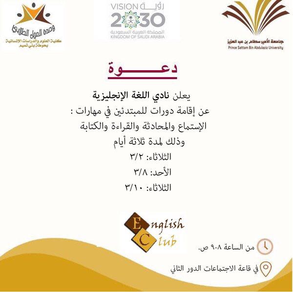 تحت رعاية عميدة كلية العلوم والدراسات الإنسانية بحوطة بني تميم الدكتورة حصة بنت سعود الهزاني، بدأ نادي اللغة الانجليزية بالكلية بتنظيم دروس للمبتدئين في مهارات الاستماع و المحادثة يوم الثلاثاء 2 / 3 / 1439 هـ الساعة الثامنة صباحاً و يستمر على مدى ثلاثة أيام متفرقة. هذة الدروس من إعداد وتقديم عضوات النادي من طالبات قسم اللغة الانجليزية وبإشراف رئيسة النادي. حضر البرنامج عدد من طالبات قسم اللغة الإنجليزية والأقسام الأخرى وأظهروا تفاعلهم وحماسهم مع ما قدم بالعرض. يهدف البرنامج بشكل أساسي إلى تطوير مستوى اللغة الإنجليزية للمبتدئين وكذلك تدريب طالبات اللغة الانجليزية على مهارات الإعداد والتقديم.