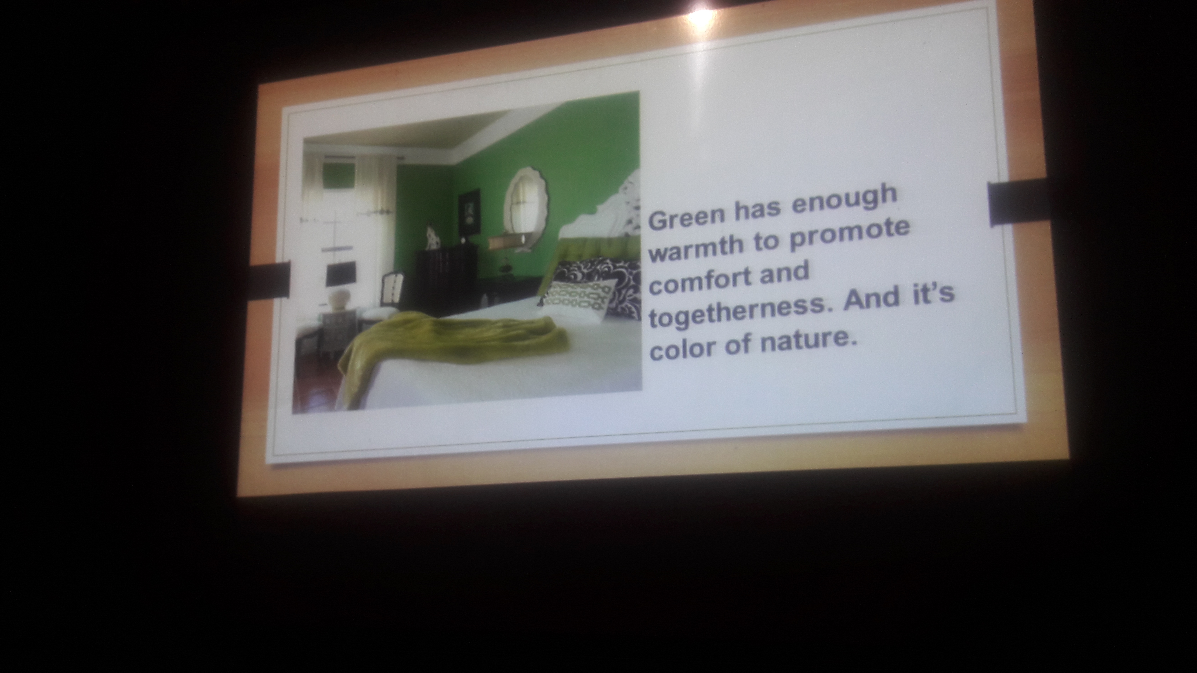 وقد قامت الطالبتان / الريم الدوسري ، و/نورة القحطاني– بايضاح أهمية اللون الأخضر في حياتنا حيث يعمل هذا اللون بامداد الأسرة بالاحساس بالدفىء والمشاركة الوجدانية . أشرفت على تقديم هذا العرض الأستاذة / صفيانو ياهوزا