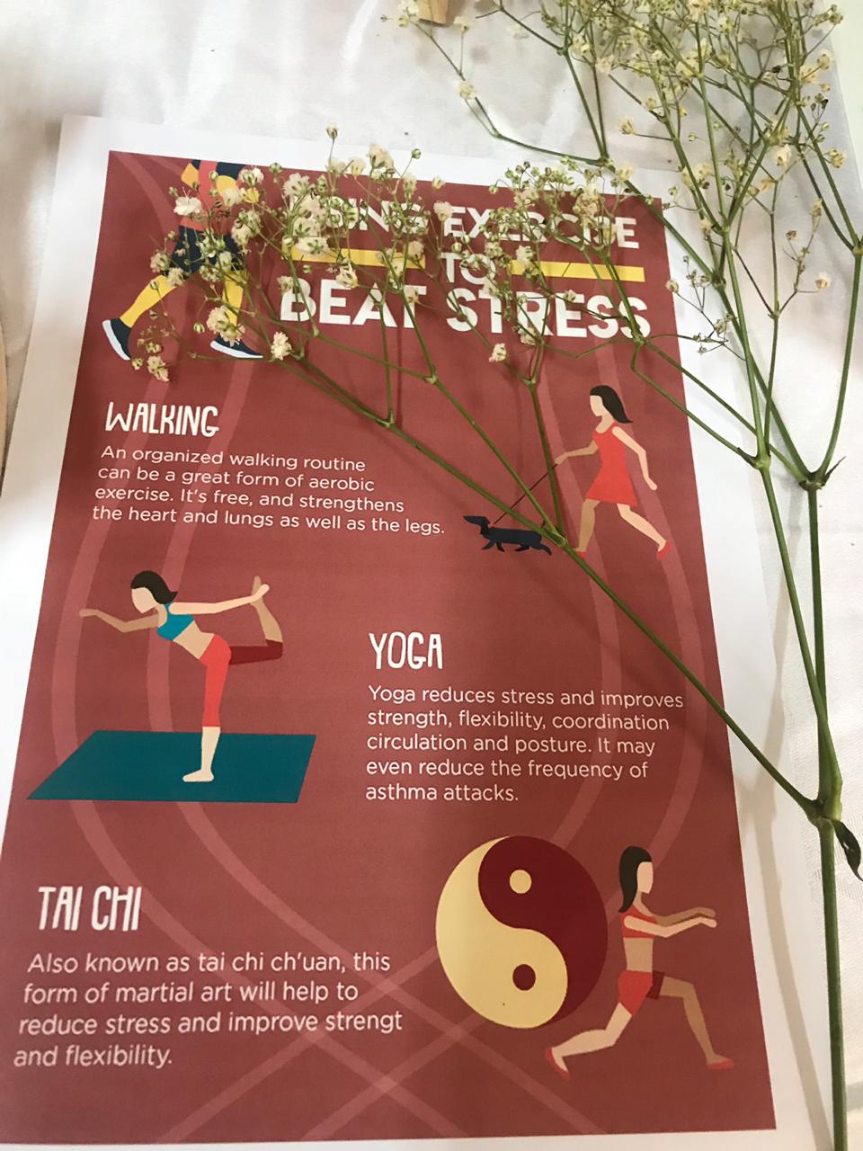 من ناحية أخرى أقام النشاط الرياضي فعالية بعنوان ( Sport and Low Stress) ، تهدف هذه الفعالية الى تعزيز ممارسة الرياضة بكافة انواعها ومالها من فوائد في خفض التوتر والقلق. كما تطرق الطالبات الى اهمية ممارسة الرياضة في ايام الاختبارات للتقليل من التوتر المصاحب لها.