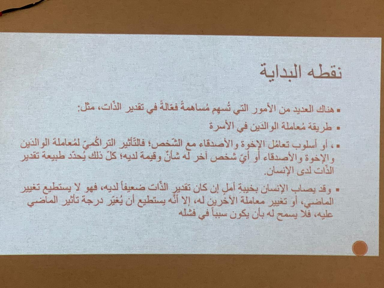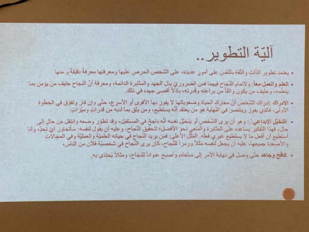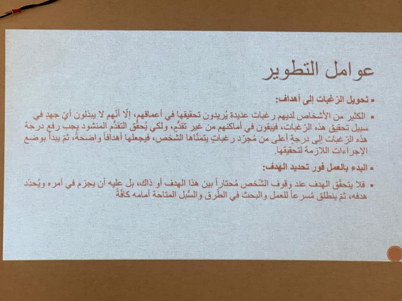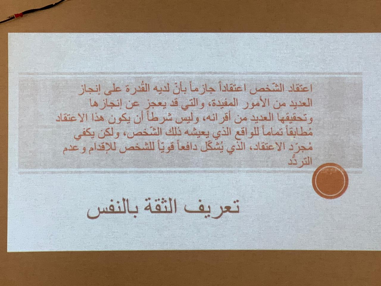 التطوير مطلب مُلح للكثير من الأشخاص وخاصة الفتيات في بداية مرحلتهم الجامعية لذلك أقام نادي العلوم الأساسية في عمادة السنة التحضيرية – قسم الطالبات محلضرة بعنوان :(الثقة بالنفس وتطوير الذات) يوم الثلاثاء الموافق 17/6/1441هـ تحت إشراف الأستاذة اقبال أحمد وإيثار عسيري. وقد تضمنت المحاضرة التعريف بمفهوم الثقة بالنفس وتطوير الذات وكذلك الحديث عن عوامل التطوير وكيفية تحويل الرغبات إلى أهداف وتسخير الجهود لتحقيق الرغبات المنشودة، كذلك تحدثت احدى الطالبات عن آلية التطوير الذي اعتمد على عوامل عديدة منها العلم والعمل معاً، الإدراك والتخيل الإبداعي.
