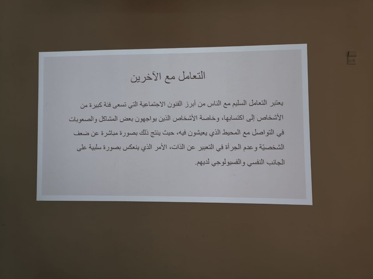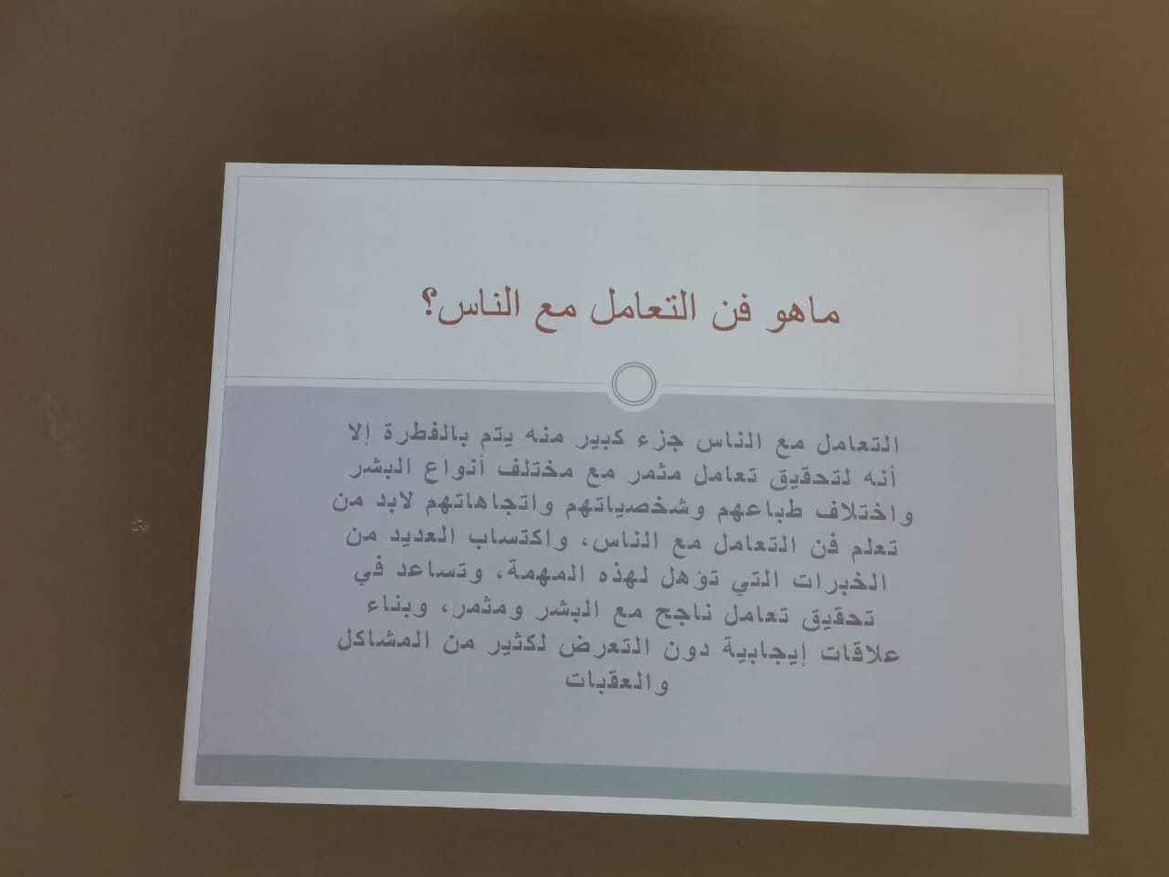 للتعامل الحسن مع الآخرين أثر يبعث في النفس المحبة والألفة، كما أنه يزيد من قوة الترابط والأخوة، وقد حثنا ديننا الإسلامي على ذلك؛ حيث أن ثواب الخلق الحسن والكلمة الطيبة عند الله تعالى عظيم. لذا أقامت طالبات نادي العلوم الأساسية بعمادة السنة التحضيرية يوم الاثنين ١٤٤١/٠٢/٢٩هـ محاضرة بعنوان ( فن التعامل مع الآخرين ) تحت إشراف أ/ فاتن منصور وأ/اقبال أحمد، ابتدان طالبات النادي بمقدمة اشتملت على أهمية حسن الخلق وأثره في المجتمع، والاقتداء برسول الله صلى الله عليه وسلم مع أهل مكة حين فتحها. أعقب ذلك شرح عن كيفية التعامل السليم و أنه نوع من أنواع الفنون الاجتماعية و أنه يجب على الفرد أن يتعلمه لكي يستطيع التعايش بسلام في مجتمعه، كما أوضحن السلوك السيء وأثره في النفس وفي المجتمع. تبع ذلك ذكر لأحاديث نبوية و آيات قرآنية عن حسن الخلق، و من ثم توزيع برشورات على الحضور بها عبارات عن فن التعامل و حسن الخلق.